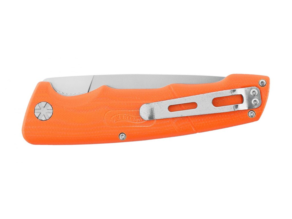 Cuțit de vânătoare, masiv, pliabile. Lamă din oțel D2. Lungimea lamei este de 10,2 cm, lungimea totală de 23,5 cm. Mâner din G10, de culoare portocaliu.