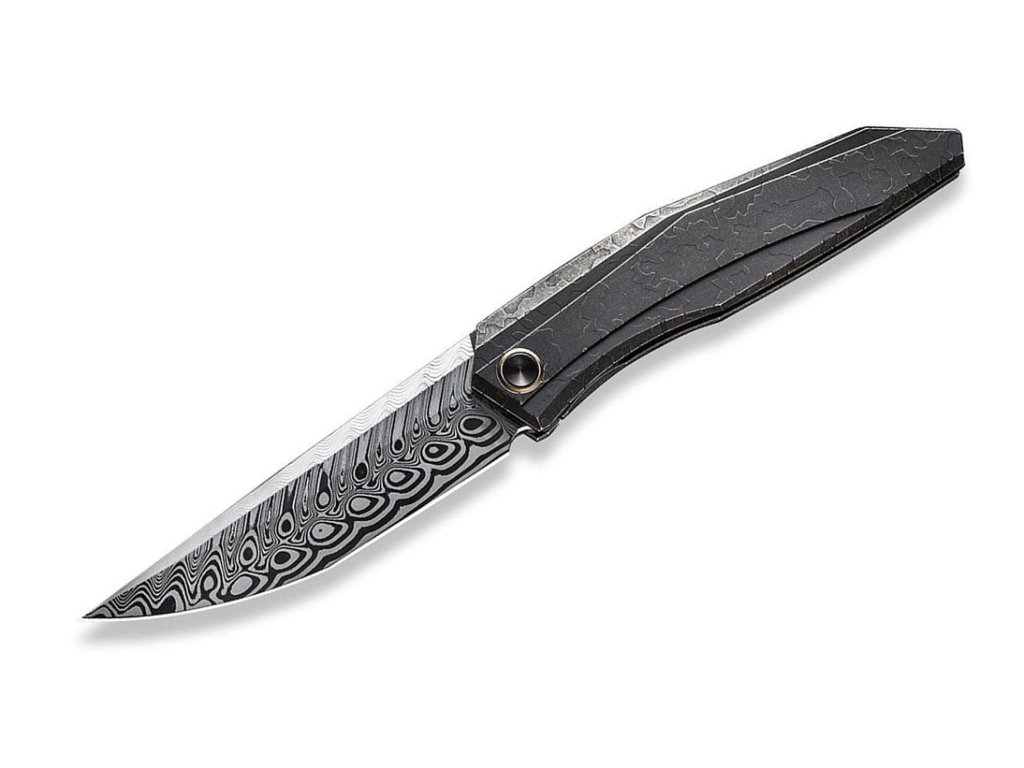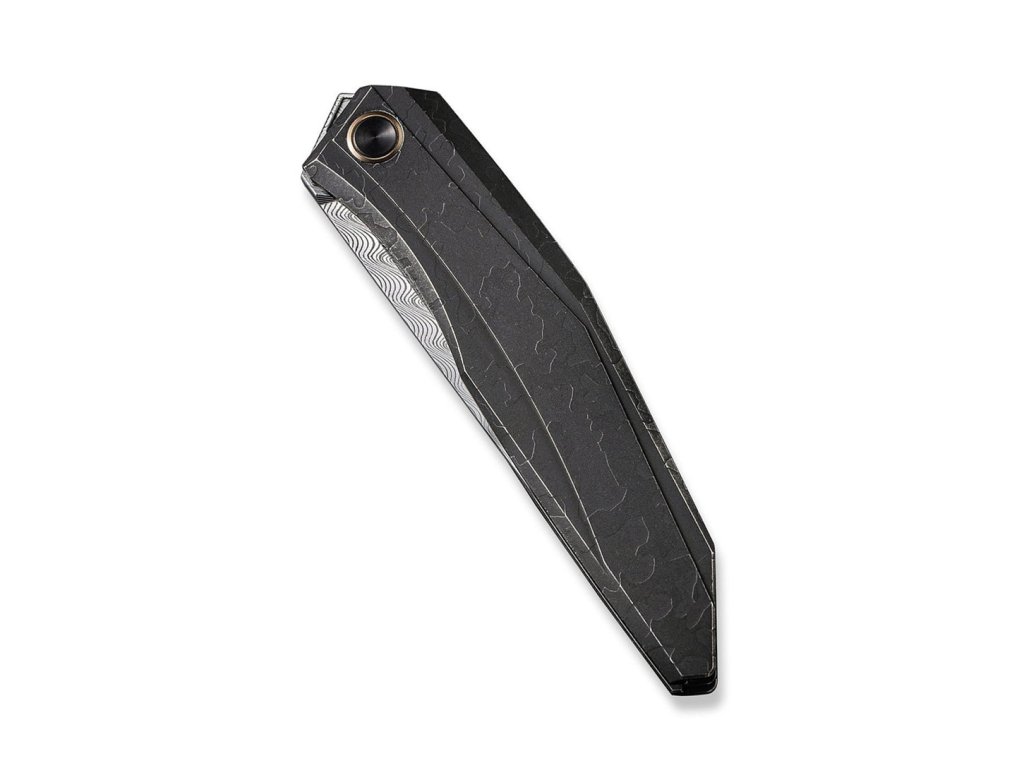 Cuțit de buzunar, realizat din oțel de damasc. Lungime totală de 22,5 cm, lamă de lungime 10 cm. Mâner din titan negru. Greutate 123 g.