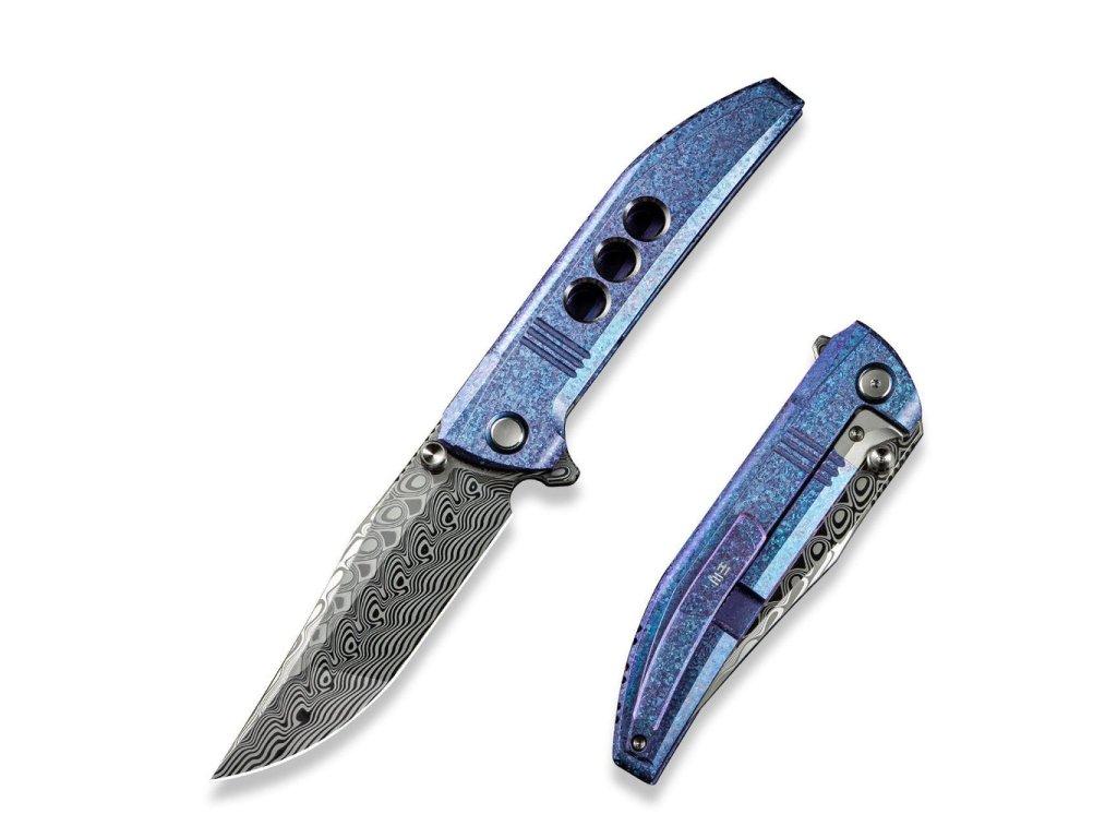 Cuțit pliabil, premium, cu lamă din oțel de damasc exclusiv, și mâner din titan 6AL4V în finisaj albastru-violet. Lungimea lamei este de 10,1 cm.