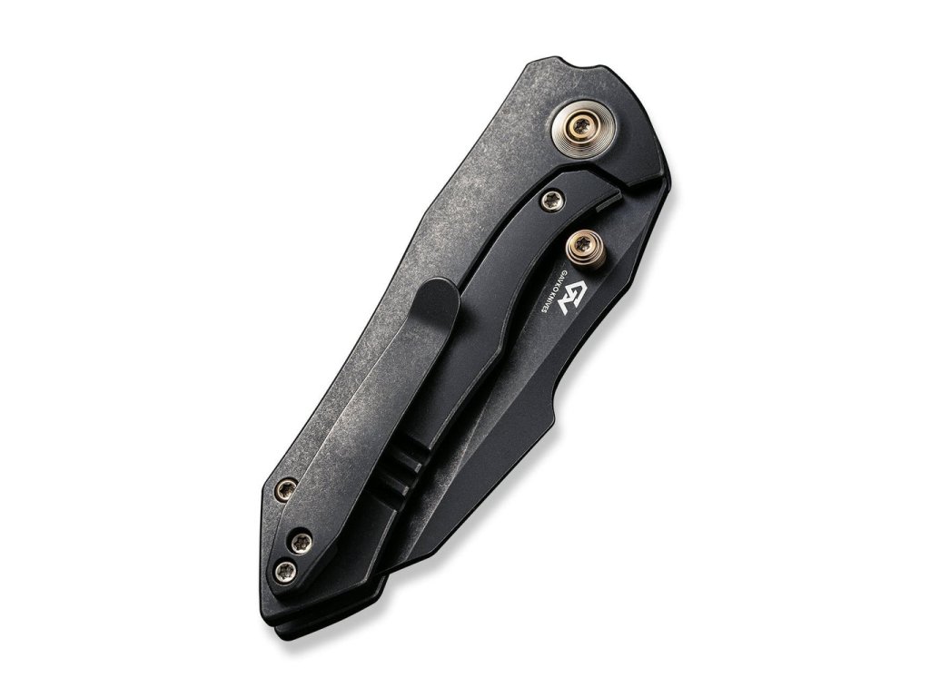 Cuțit pliabil din oțel inoxidabil CPM20CV. Lungime totală 17,7 cm, lamă inversă tanto de lungime 7,5 cm. Mâner metalic de lungime 10,2 cm.