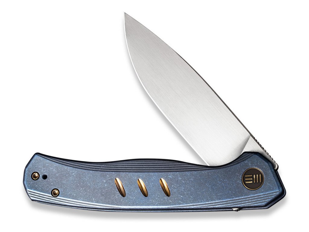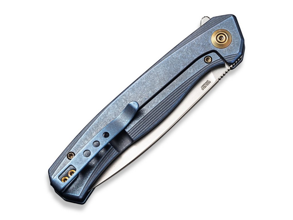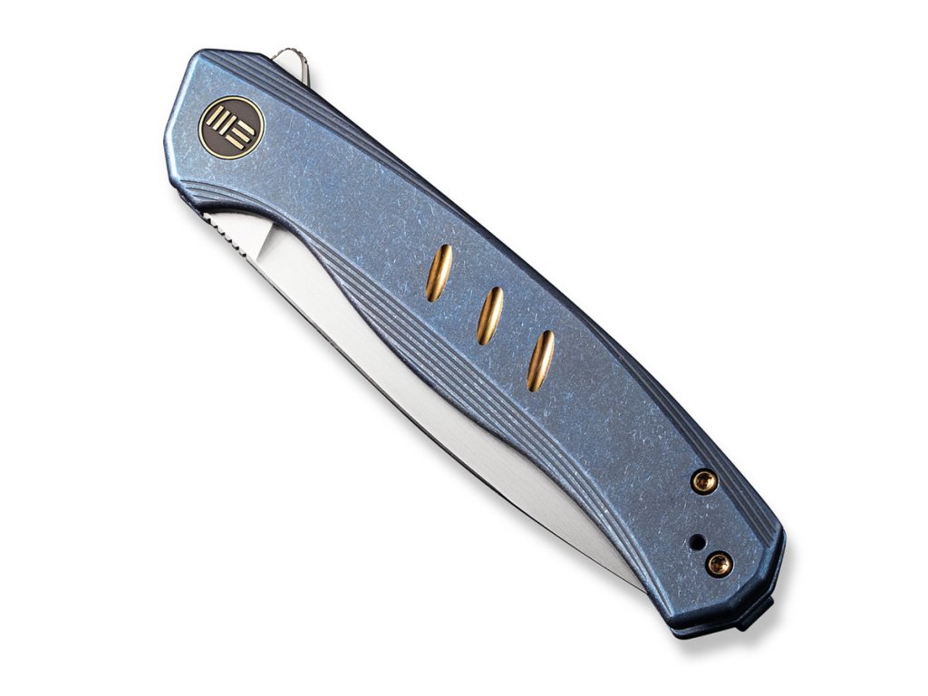 We Knife Seer este un cuțit exclusiv de colecție, ediție limitată - 610 bucăți. Lamă de lungime 8,83 cm, din oțel CPM20CV și mâner din titan albastru.