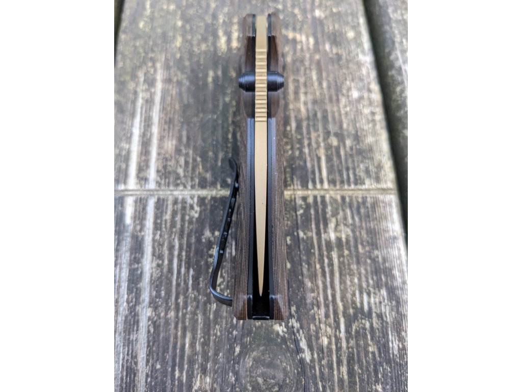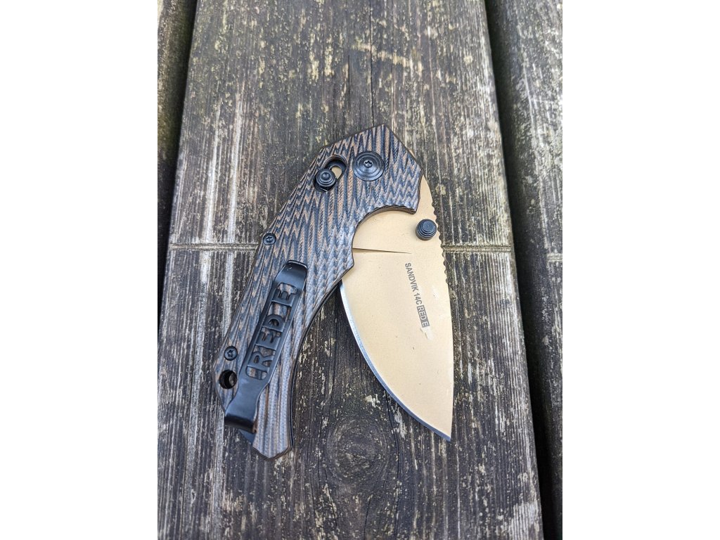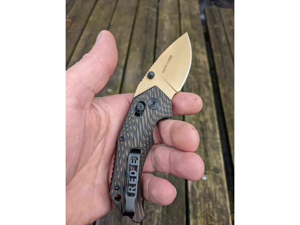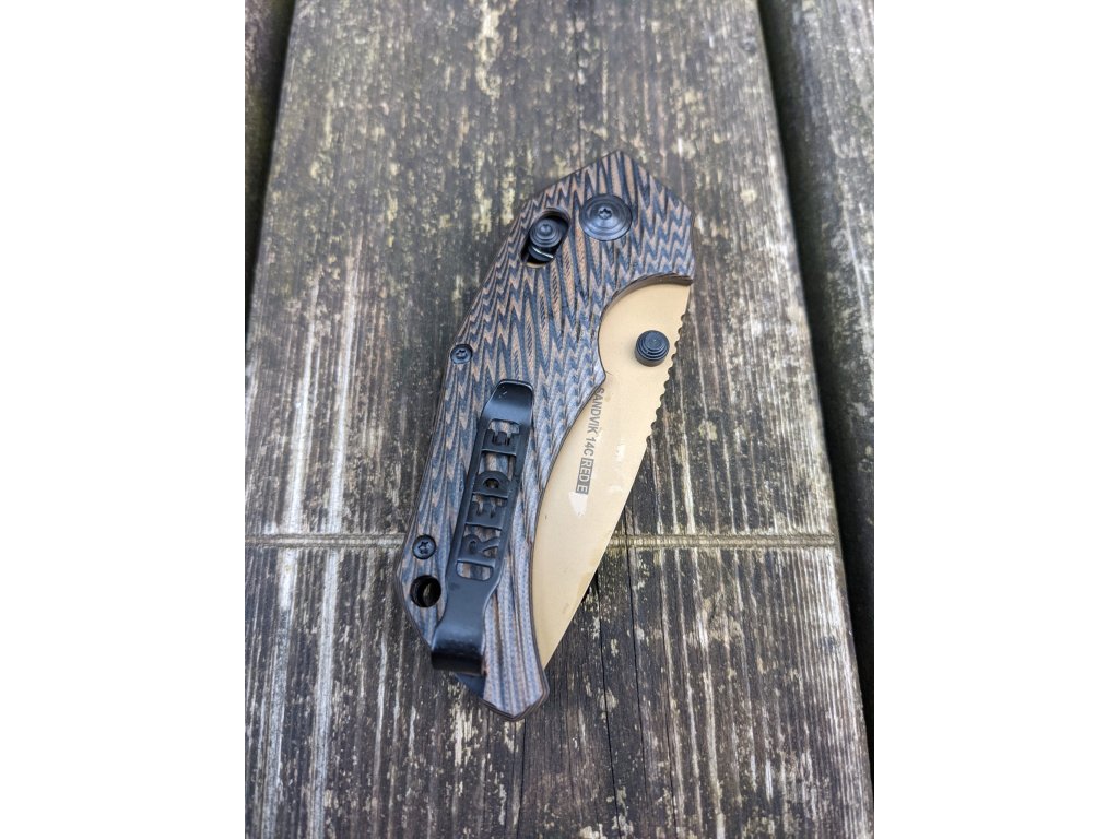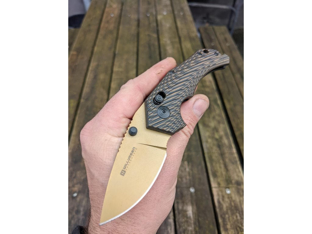 Cuțit EDC Willumsen Red E Two-Tone Desert Tan/Black cu o lamă scurtă de 7 cm. Mânerul este fabricat din mâner G10, iar lama este fabricată din oțel Sandvik 14C28N.