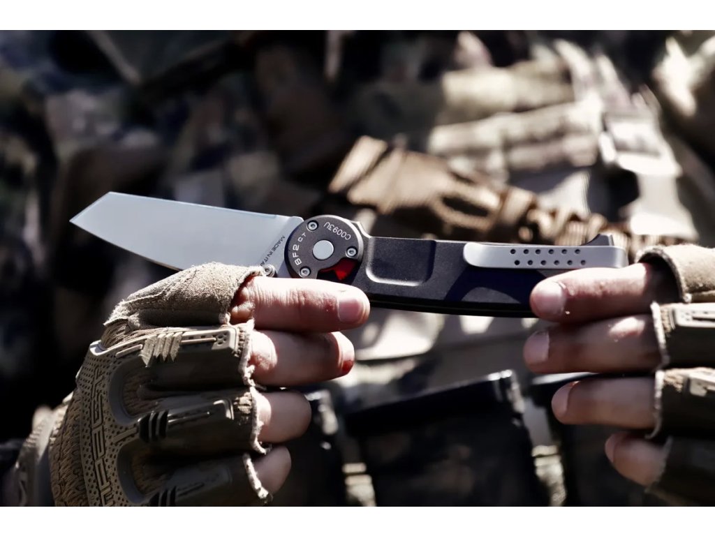 Cuțit EDC pliabil din oțel Böhler N690 cu formă tanto. Mâner din aluminiu anodizat rezistent la coroziune. Lungimea lamei 8,7 cm și lungimea totală 21,3 cm.