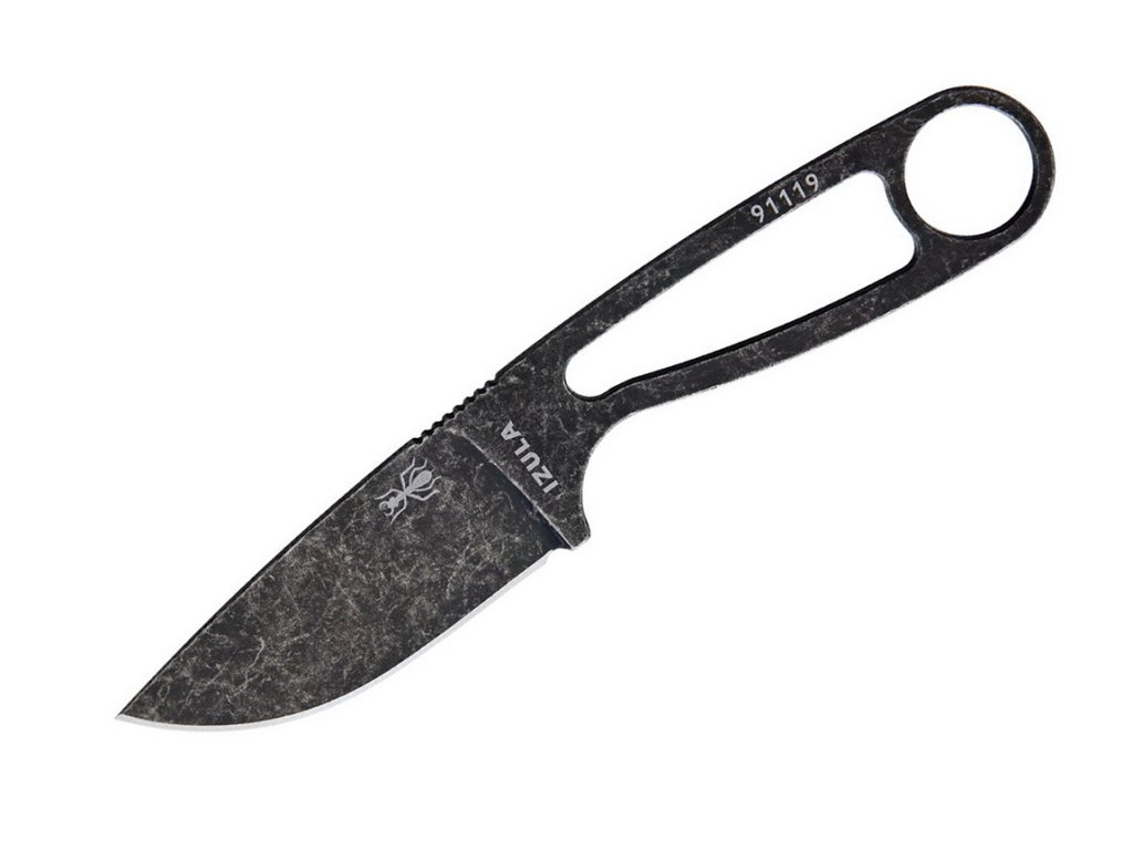 ESEE Izula este un cuțit mic și ușor, potrivit pentru purtat la gât sau ascuns. Lama, de lungime 6,68 cm, fabricată din oțel carbon 1095, are un finisaj black oxide și un tăiș tip flat grind. Teacă din plastic, neagră, cu clemă pentru agățare.