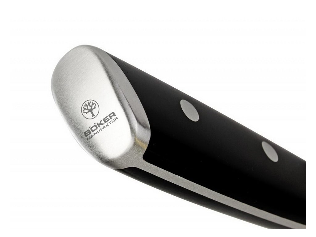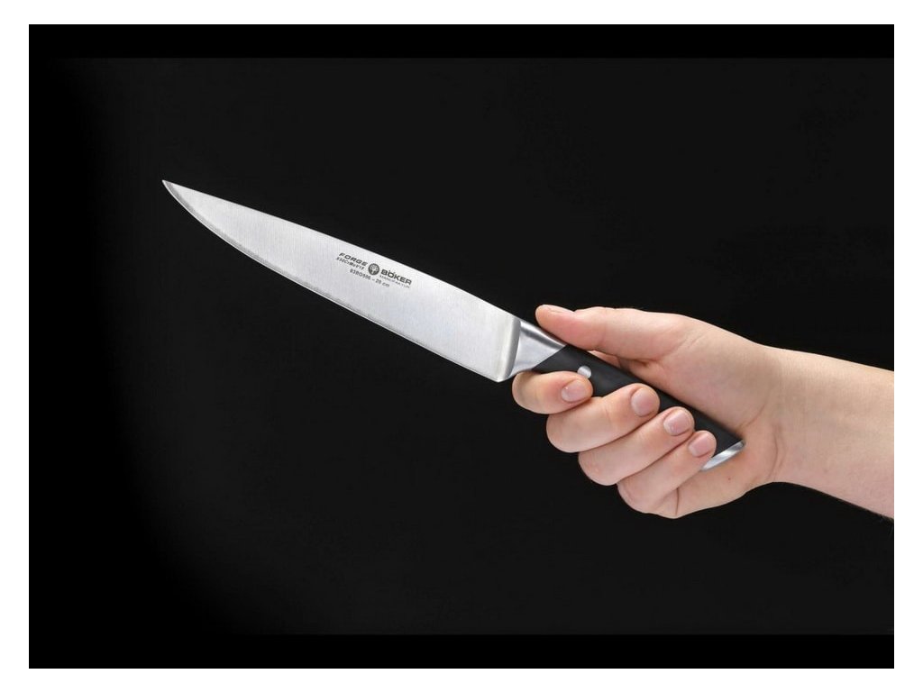 Cuțit de bucătărie de lux Böker din gama Forge, fabricat în Solingen, Germania. Acest cuțit este ideal pentru prelucrarea cărnii sau a peștelui. Are o construcție integrală, realizat din oțel crom-molybdén-vanadiu X50CrMoV15, care este mai rezistent și menține mai bine. Mânerul din plastic ABS oferă o prindere excelentă și un aspect atrăgător.