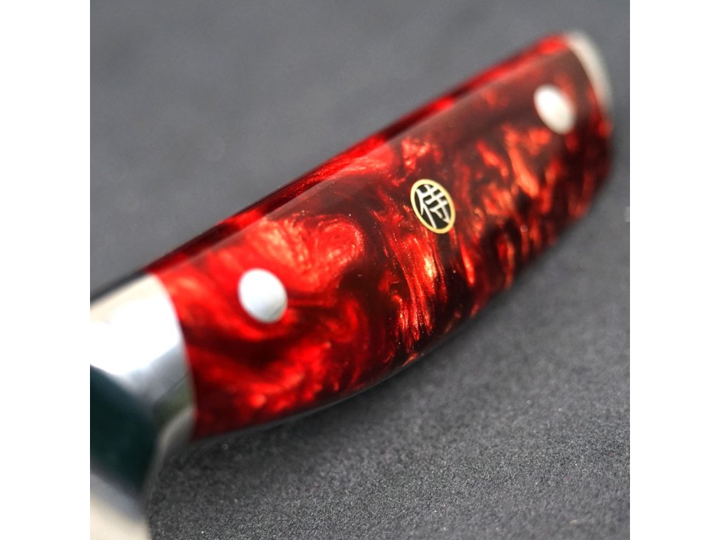 Mânerul este fabricat din rășină epoxidică, care este colorată cu pigmenți alcooli în culori calde, care pot schimba foarte ușor culoarea în timp. Niturile triple conferă instrumentului o rezistență perfectă, stabilitate și o legătură între tăiș și mâner. Mânerul ergonomic este lustruit cu cea mai mare grijă și proiectat pentru o manevrabilitate excelentă. Rășina este rezistentă și complet inodoră, practic nu necesită întreținere. Nu va coroda sau oxida în timp, astfel încât materialul va rămâne solid și dur.