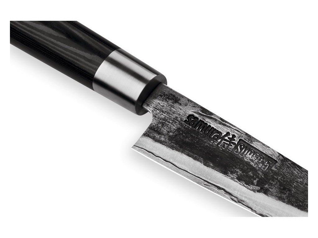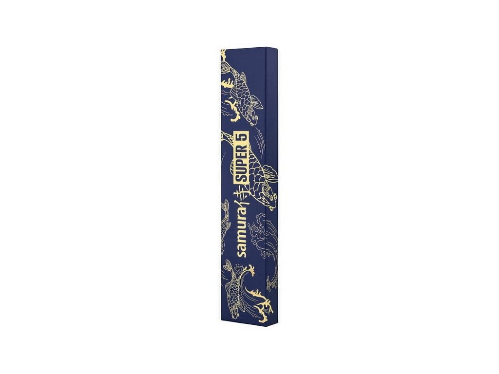 Cuțitele Samura Super 5 sunt cuțite pentru bucătărie exclusive, care oferă forme tradiționale japoneze, mâner din material compozit rezistent micarta și lame din oțel de damasc japonez forjat manual (5 straturi) cu miez din oțel VG-10. Miezul din oțel VG-10 este foarte dur și atinge o duritate de până la 61 HRC. Datorită acestui fapt, cuțitele rămân ascuțite pentru o perioadă foarte lungă de timp. Avantajul oțelului forjat manual este rezistența și fiabilitatea ridicată, precum și aspectul neobișnuit, deoarece fiecare piesă este originală. Finisajul suprafeței lamei hammered steel este foarte atractiv și asigură o tăiere lină, fără ca alimentele tăiate să se lipească de cuțit. Cuțitul este ambalat într-o husă din pânză foarte frumoasă, în stil japonez, și depozitat într-o cutie cadou.