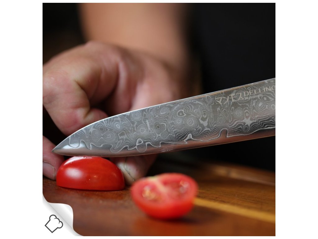 Cuțitul versatil Dellinger Manmosu Professional Chef din oțel de damasc, cu o lungime a lamei de 13 cm, poate fi utilizat pentru a tăia toate tipurile de ingrediente. Cu acest cuțit universal, puteți realiza tăieturi precise atunci când pregătiți mâncărurile preferate. Cu o lamă suficient de lungă, puteți tăia cu ușurință bucățile de carne, precum și bucăți mai mici de legume sau fructe. Mânerul lucios din lemn vă oferă un control maxim la fiecare tăietură. Cuțitul este o alternativă excelentă pentru cei cărora nu le place să taie cu cuțite mari de bucătar, dar doresc să tăie precis ingredientele. Potoliți-vă rapid foamea și începeți să pregătiți sandvișurile preferate folosind cuțitele de bucătărie Dellinger.