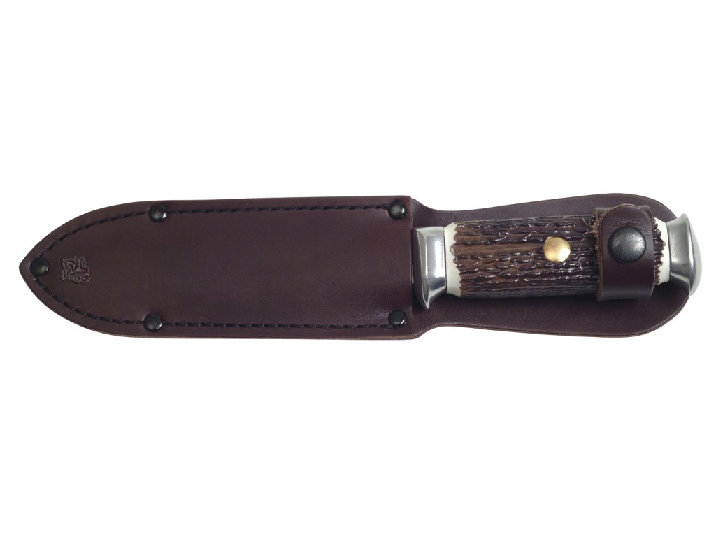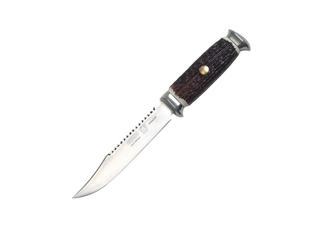 Cuțit de vânătoare cu lama fixă din oțel inoxidabil, dotat cu o lamă de ferăstrău pe partea superioară. Are un mâner durabil din imitație de corn, ceea ce îl face ușor și ușor de transportat. Este livrat cu o teacă din piele.