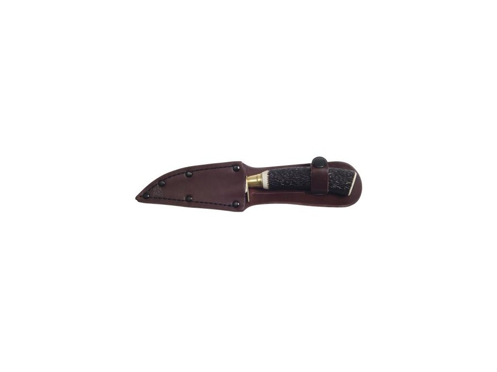 Cuțit de vânătoare, cu vârf îngust și mâner din plastic - imitație de corn. Cuțitul este livrat cu o teacă atractivă din piele pentru transport ușor.