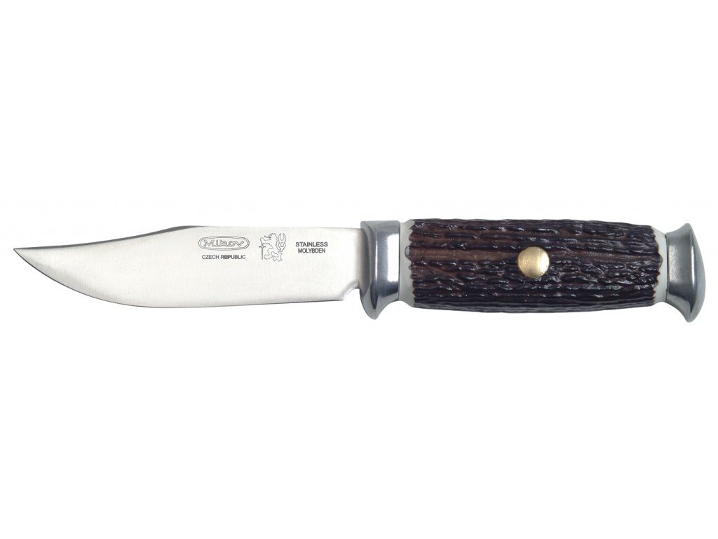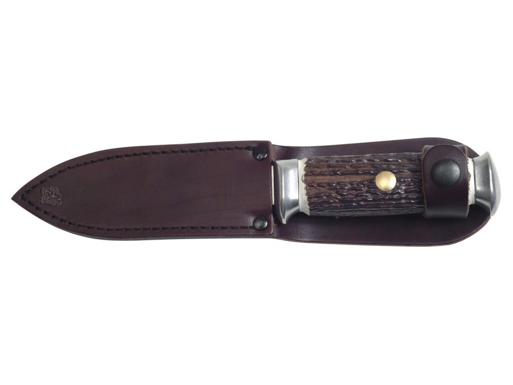 Cuțit de vânătoare cu preț atractiv, având o lama fixă din oțel inoxidabil de 27 mm lățime. Are un mâner durabil din imitație de corn, ceea ce îl face ușor și ușor de întreținut. Este livrat cu o teacă atractivă din piele.