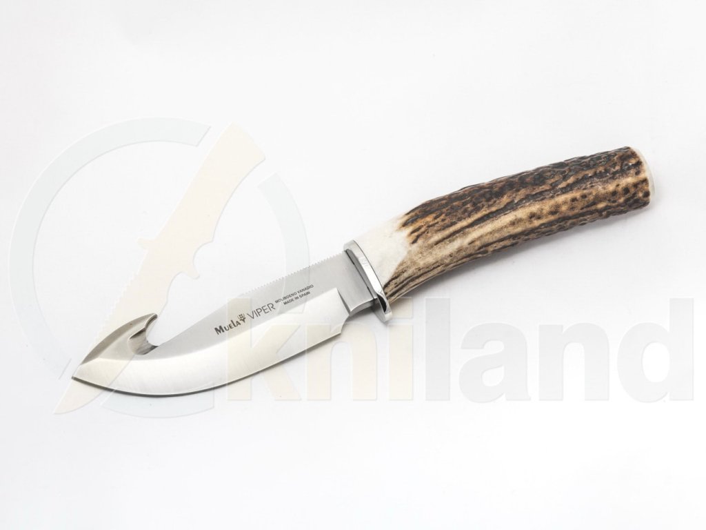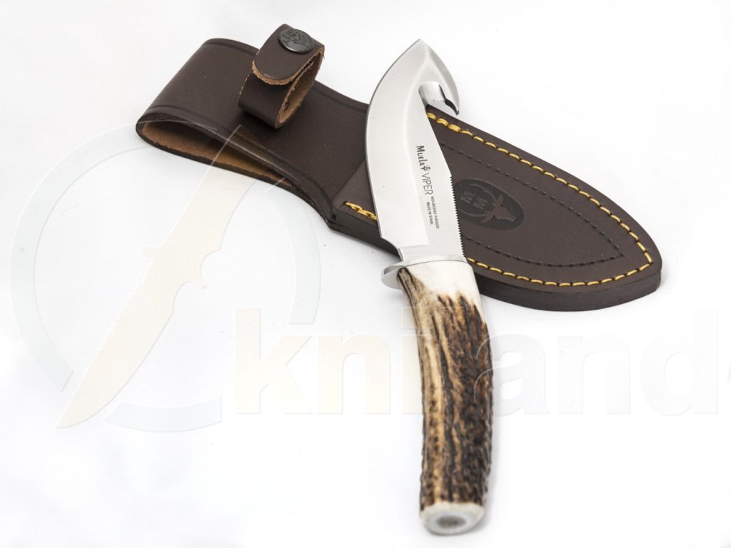 Cuțit de vânătoare de calitate cu cârlig pentru jupuire, ideal pentru vânători. Forma lamei facilitează jupuirea și pe partea din spate se află un cârlig pentru eviscerare. Lama cu lungimea de 11 cm este fabricată din oțel inoxidabil de calitate superioară X50CrMoV15 și pe partea din spate are zimți. Mânerul este fabricat din corn de cerb. Se livrează cu o teacă din piele maro.