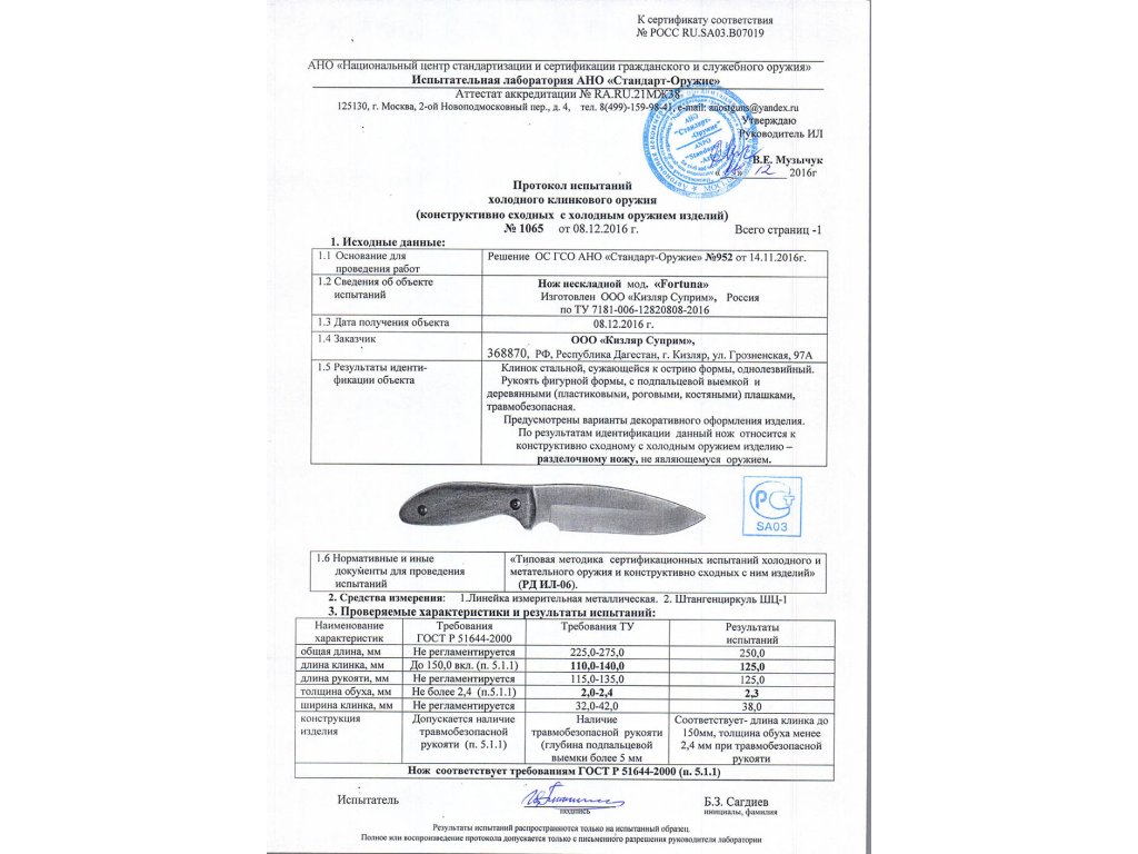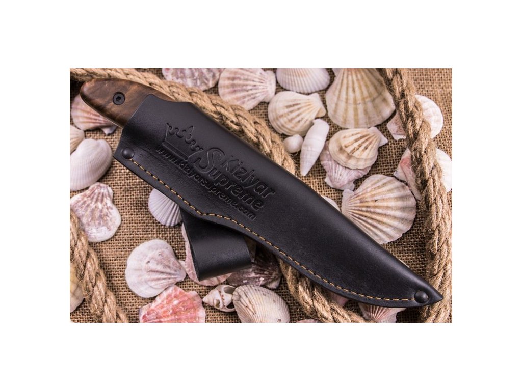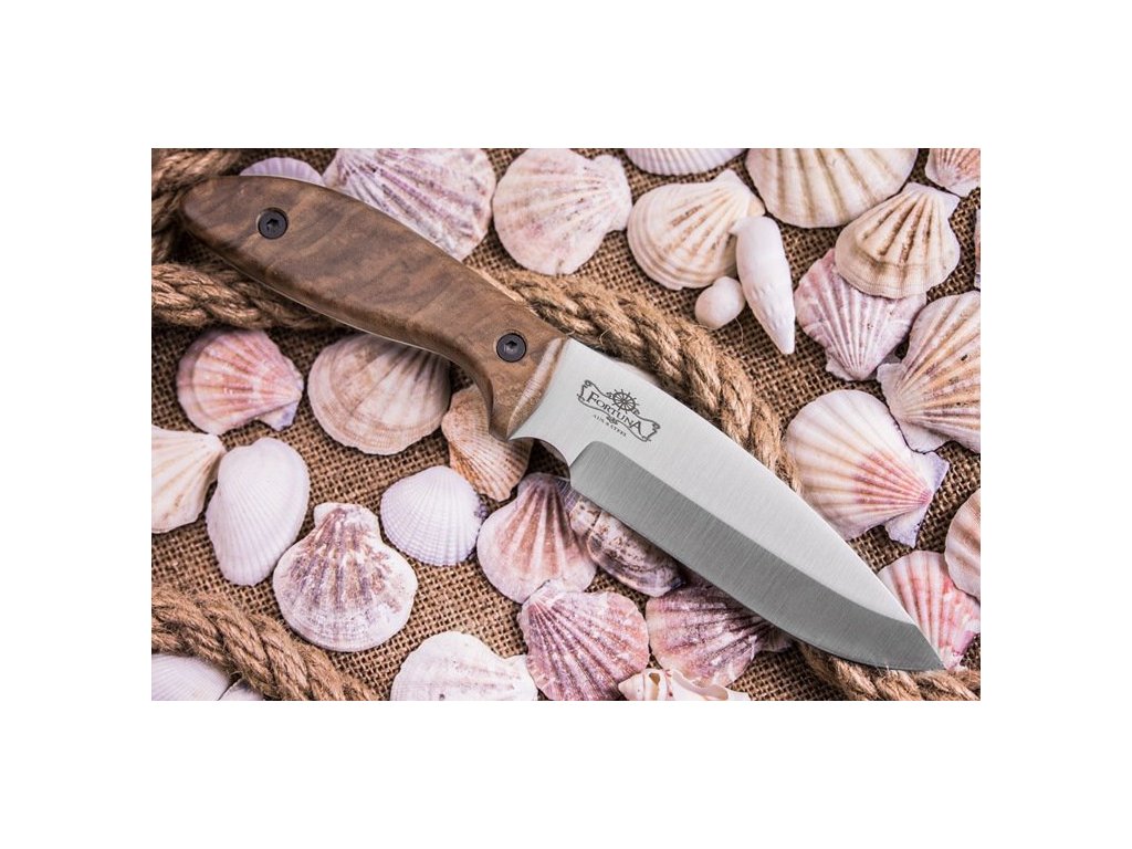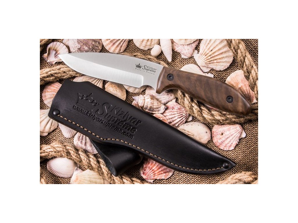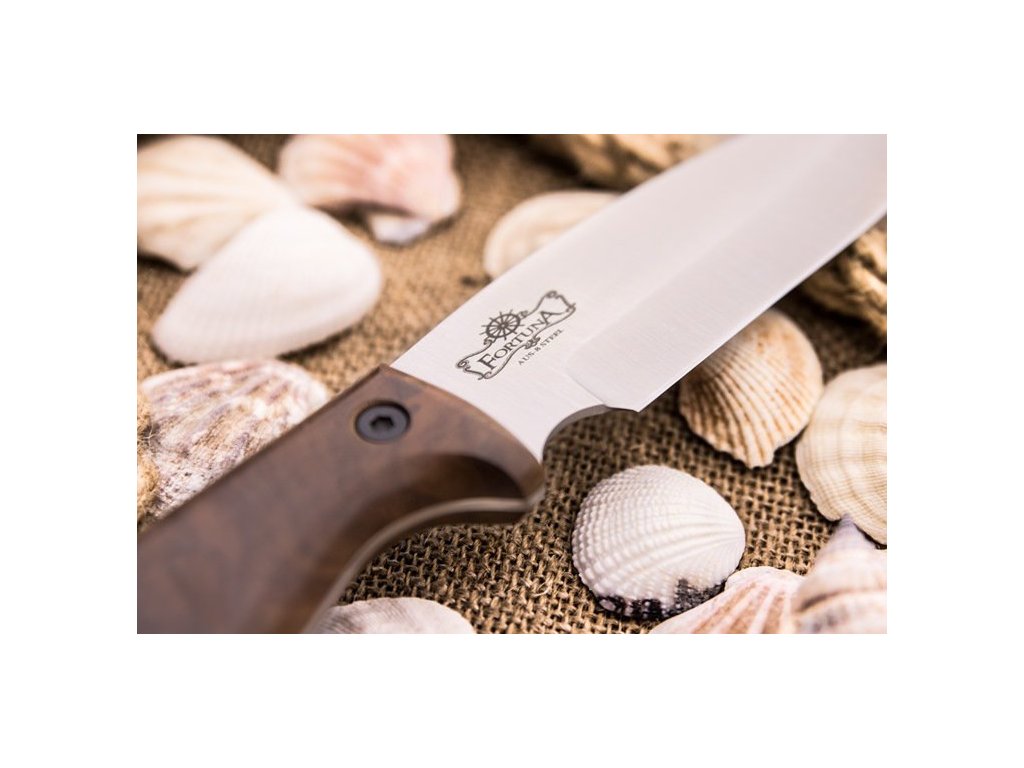 Cuțitul Kizlyar Supreme Fortuna este un cuțit universal de dimensiuni medii, potrivit pentru activități în aer liber, camping sau pentru vânătoare. Construcția full tang îi asigură rezistența și fiabilitatea. Lama realizată din oțel AUS-8, duritate 57-59 HRC, cu un finisaj fin stonewash, are proprietăți excelente de tăiere datorită grosimii sale mai mici (2,4 mm). Mâner realizat din nuc caucazian. Cuțitul este livrat cu o teacă din piele.