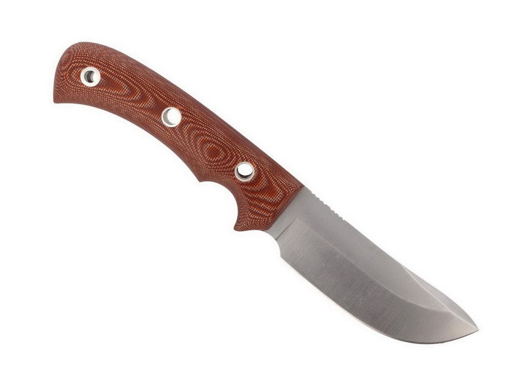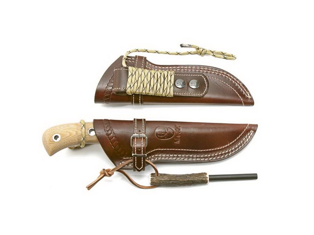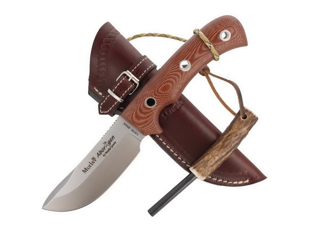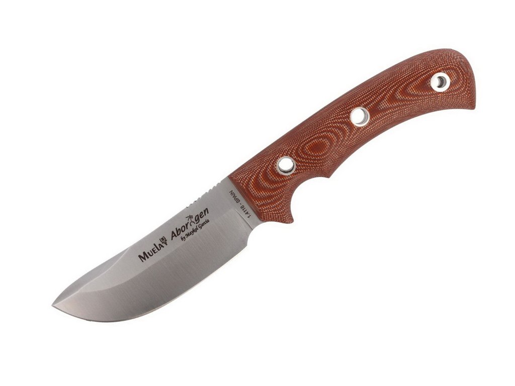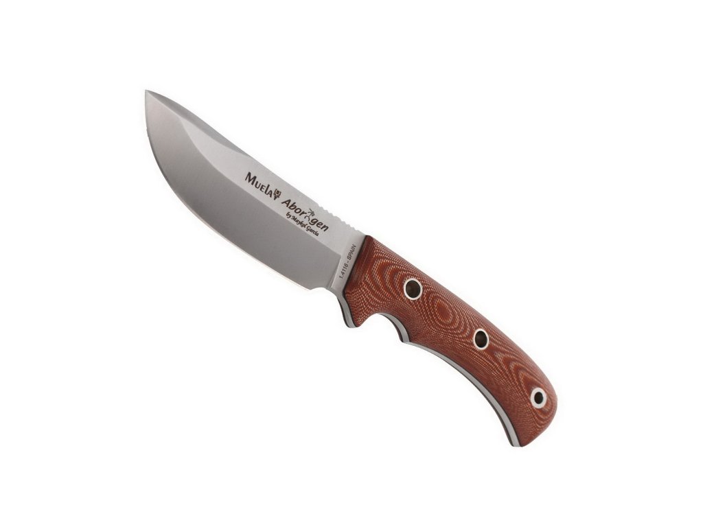 Cuțit de vânătoare Aborigen de la producătorul spaniol Muela. Cuțit mare cu o construcție full tang și datorită mânerului foarte mare se potrivește bine chiar și pentru bărbații cu mâini mari. Forma rotunjită a lamei și mânerul durabil din micarta maro fac ca acest cuțit să fie un mare ajutor pentru fiecare vânător. Este inclusă o teacă din piele foarte bine lucrată, un kit pentru aprinderea focului și o bucată de paracord.