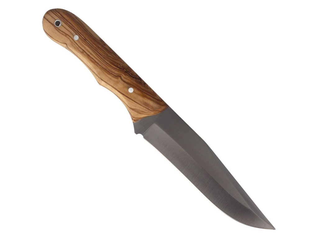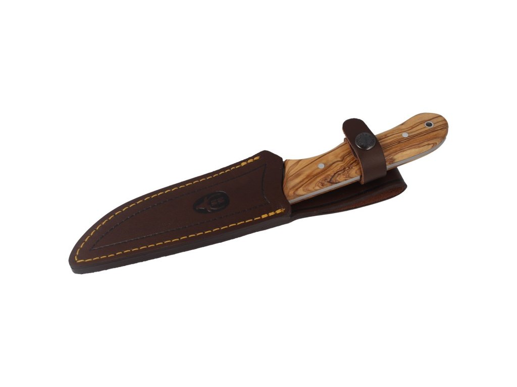 Cuțit elegant potrivit pentru vânătoare și activități în aer liber. Datorită construcției sale, este extrem de rezistent și fiabil chiar și în condiții dificile. Cuțitul este fabricat dintr-o singură bucată de oțel molibden-vanadiu. Mânerul din lemn de măslin are un design ergonomic, și se potrivește perfect în mână. La capătul mânerului există un orificiu pentru șnur. Cuțitul este livrat cu o teacă din piele maro.