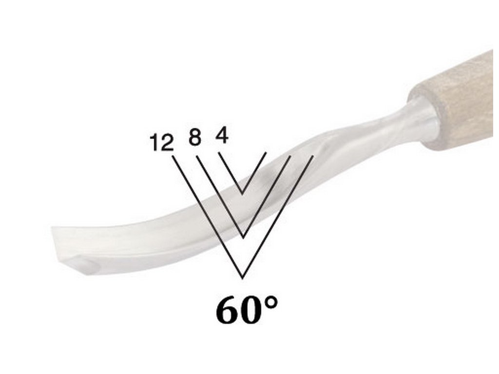 Daltă pentru sculptură în lemn în formă de lingură - în V, cu profil al lamei de 60°. 12 mm lățime.