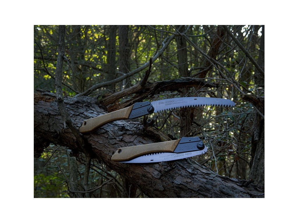 Fierăstrău profesional pliabil realizat și adaptat pentru utilizarea în aer liber la tăierea lemnului și a oaselor. Este potrivit pentru camping și vânătoare, pentru care este ideal prin lungimea lamei de 240 mm, prin densitatea dinților (8 dinți per lamă de 30 mm) și prin finisajul negru ce conține nichel și staniu, finisaj ce prelungește durata de viață a lamei, îmbunătățește rezistența la uzură și previne strălucirea nedorită. Lama curbată permite tăierea confortabilă și eficientă deasupra nivelului umărului. Lama este fabricată din oțel carbon SK4. Surprinde prin performanțele sale superioare de tăiere, datorită metodei patentate de ascuțire Mirai-Me a dinților, care au până la 4 unghiuri de tăiere. Mânerul este fabricat din material compozit, un amestec de lemn și plastic, asigurând o prindere confortabilă chiar și pe vreme rece, în condiții de umiditate crescută sau atunci când procesați o captură.
