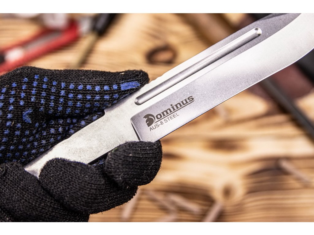 Lamă de la producătorul rus Kizlyar Supreme, din oțel inoxidabil AUS-8, duritate 57-59 HRC. Grosimea lamei 4,9 mm, are o construcție sick tang și formă drop point cu tăiș fals scurt pe marginea superioară a lamei. Finisaj tip Stonewash și tăiș tip flat grind. Lungime totală 27,8 cm, lungimea lamei 14,7 cm. Lama este tratată, este livrată neascuțită. Puteți să alegeți singur unghiul de ascuțire, în funcție de modul în care intenționați să utilizați cuțitul
