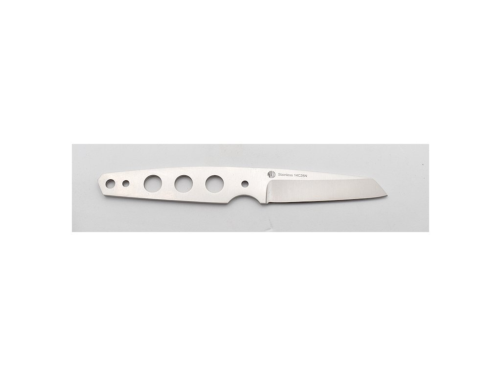Lamă pentru confecționarea cuțitelor. Grosime 4 mm, fabricată din oțel inoxidabil Sandvik 14C28N, construcție full tang, lungimea totală 19 cm, lungimea lamei 8 cm, lățimea lamei 2,9 cm, diametrele găurilor 2 x 4,6 cm și 1 x 6,3 mm. Lama are un tăiș de tip flat grind.