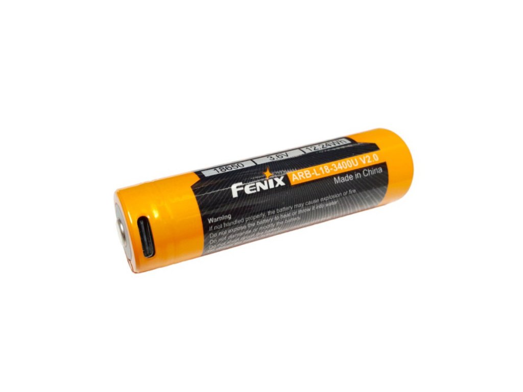 Baterie reîncărcabilă Fenix 18650 3400 mAh cu conector de încărcare USB-C (ARB-L18-3400U V2.0). Poate fi încărcată prin introducerea unui cablu în conectorul USB-C (de exemplu, de la un încărcător de telefon mobil) sau într-un încărcător care poate găzdui acumulatori Li-ion cu o lungime de 72 mm. Bateriile Li-Ion reîncărcabile sunt caracterizate de o capacitate foarte mare și nu suferă de efectul de memorie sau de autodescărcare.