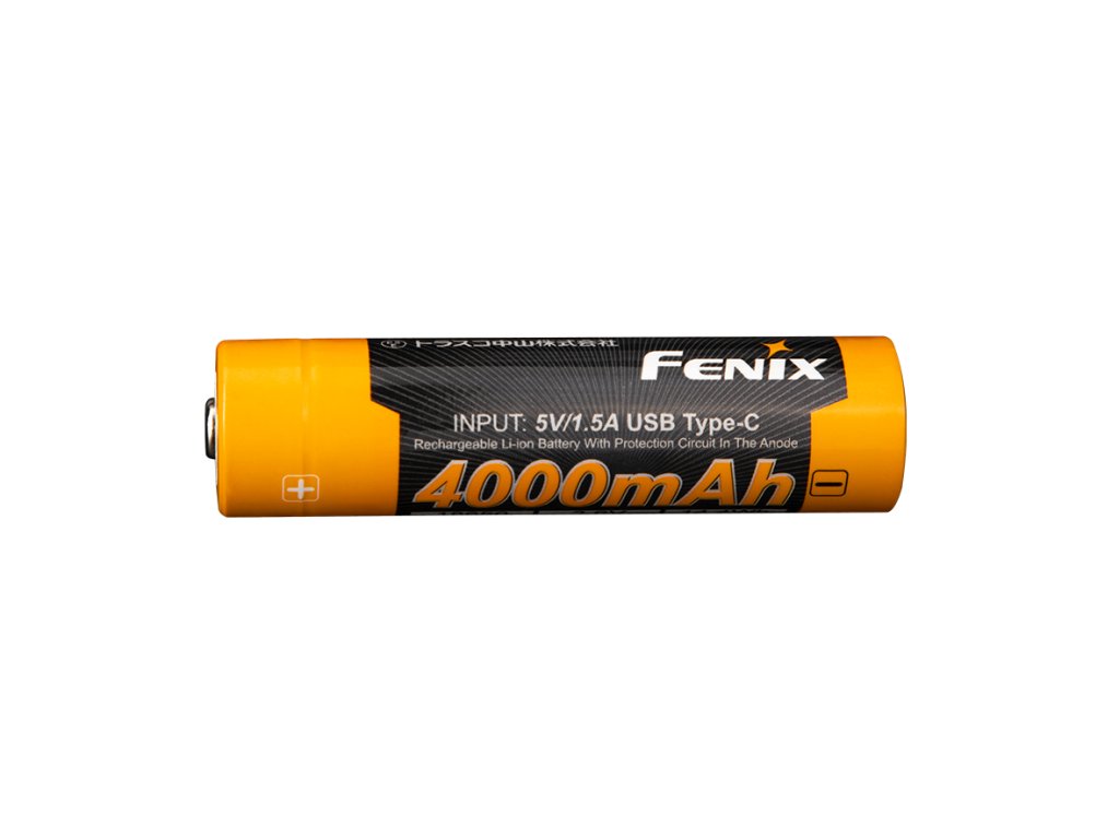 Baterie reîncărcabilă Fenix 18650 4000 mAh cu conector de încărcare USB-C (ARB-L18-4000U). Poate fi încărcată prin introducerea unui cablu în conectorul USB-C (de exemplu, de la un încărcător de telefon mobil) sau într-un încărcător care poate găzdui acumulatori Li-ion cu o lungime de 72 mm. Bateriile Li-Ion reîncărcabile sunt caracterizate de o capacitate foarte mare și nu suferă de efectul de memorie sau de autodescărcare.