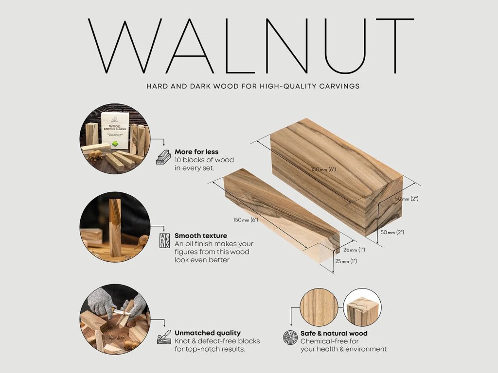 Set de lemn de nuc pentru sculptură, în două dimensiuni diferite, cu un total de 10 bucăți. Lemnul de arin este excelent pentru sculptură datorită culorii sale frumoase și aspectului elegant.