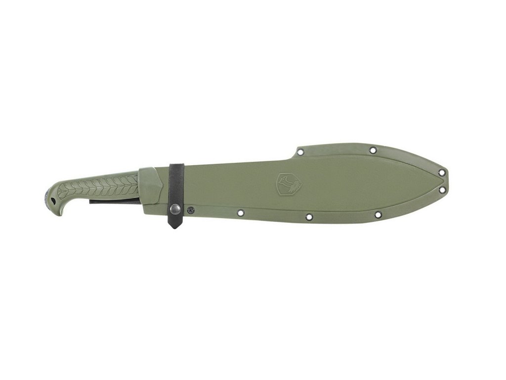 Macetă din oțel 1075 cu conținut ridicat de carbon, lungime totală 52,6 cm, lungime lamă 37 cm, grosimea lamei 3 mm, mâner și teacă din polipropilenă verde durabilă.