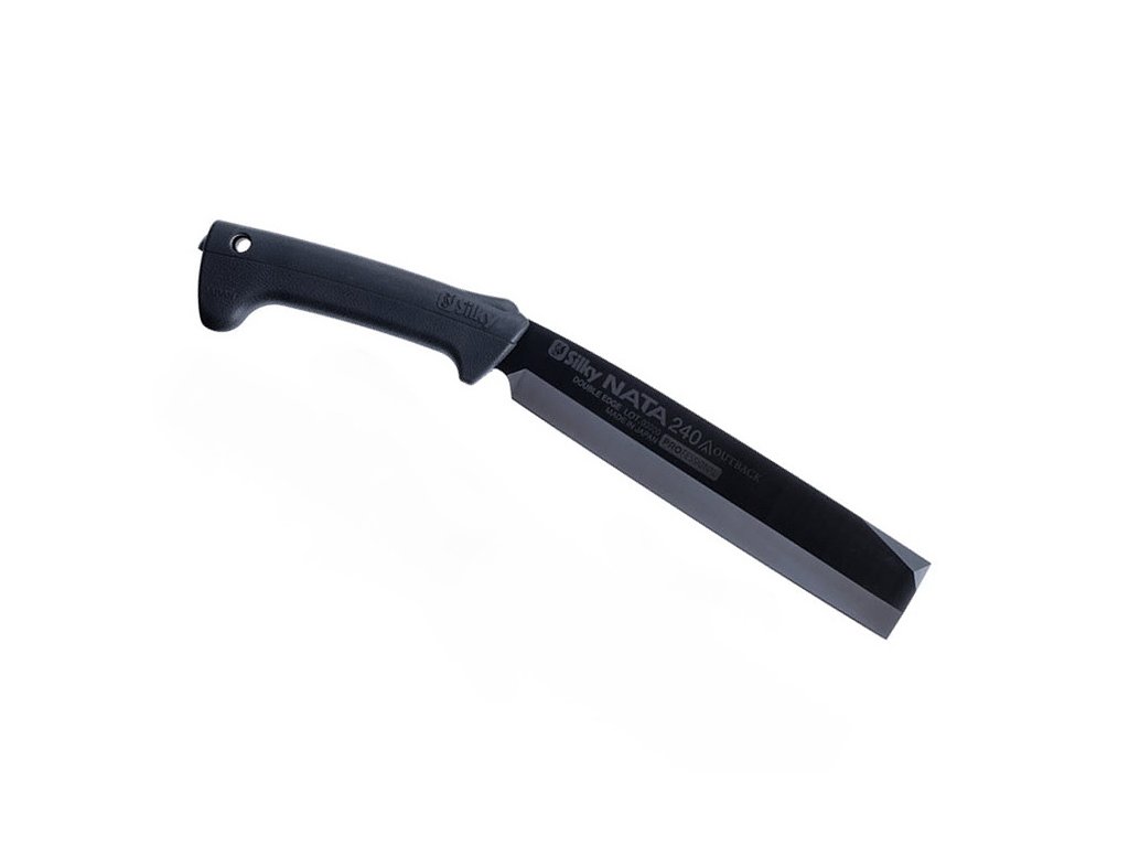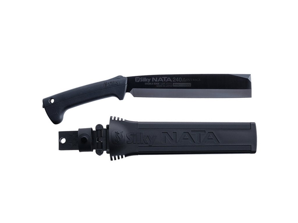 Noul Nata Outback se dovede a fi partenerul ideal pentru activități în aer liber, deoarece combină funcțiile unui topor și ale unui cuțit. Odată cu lansarea noului model Nata, compania Silky introduce și o tehnică inovatoare de tratare a suprafeței lamei. Silky Black Oxide combină metoda tradițională japoneză de protecție împotriva ruginii cu tehnologia modernă avansată. Lama de 24 cm este forjată în mod unic din oțel pentru unelte de calitate SKS-51 (JIS). Lungimea totală a macetei este de 46 cm și greutatea de 730 g o fac un instrument robust, care poate face față chiar și celor mai solicitante și extreme sarcini. Nata Outback este livrat cu o teacă neagră robustă, care are o clemă pentru curea, ceea ce vă permite să o aveți mereu la îndemână în timpul aventurilor.