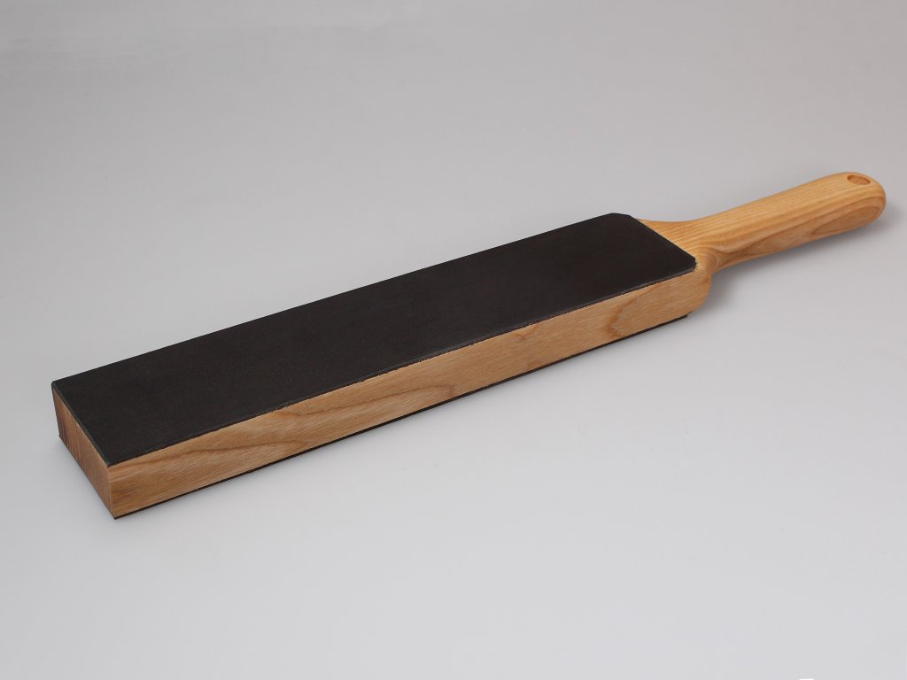 Placă din lemn dublă, cu piele, destinată ascuțirii sau lustruirii cuțitelor, dălților sau briciuri. Pielea este fixată ferm pe placa din lemn de frasin. Poate fi folosită fie singură, fie în combinație cu o pastă de ascuțit. Materiale: piele de vită, lemn tare. Pachetul include și o pastă de ascuțit cu granulație aproximativ 6 microni. Lungime totală: 37 cm