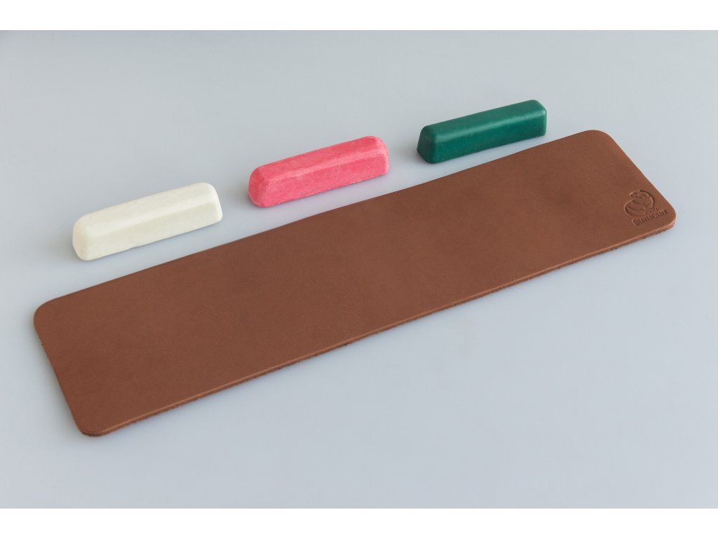 Piele lungă, cu două fețe, pentru ascuțit cu 3 paste diferite pentru ascuțit. Dimensiuni 31 x 7,5 cm, culorile pastelor sunt o combinație de verde, roșu, alb.