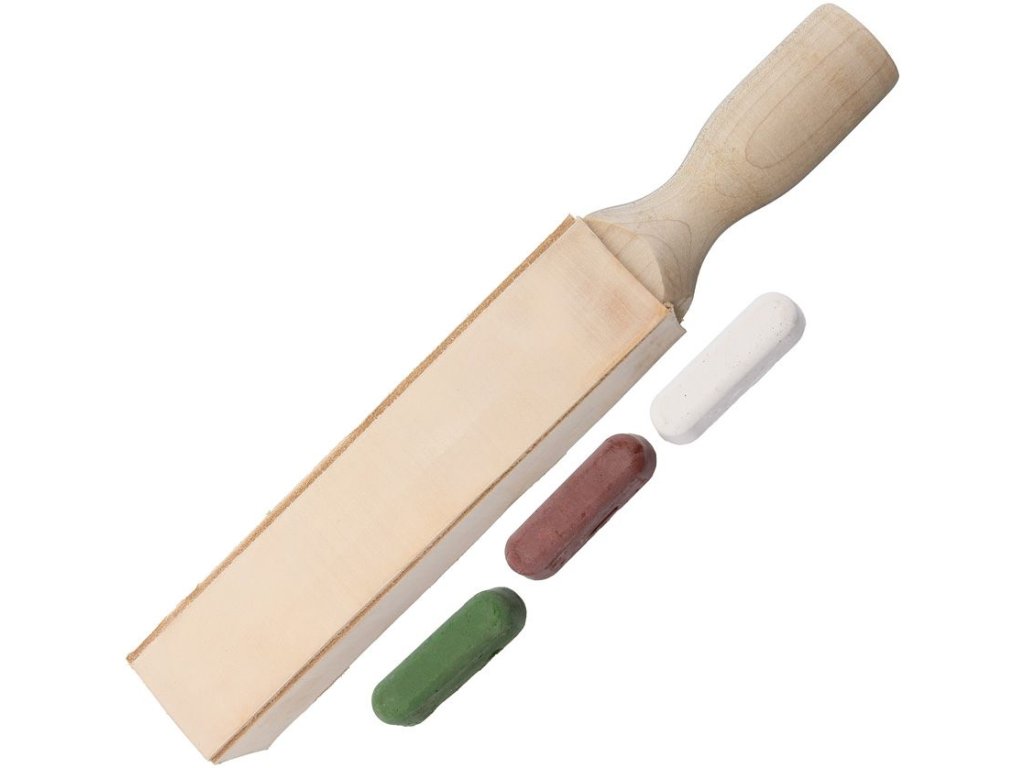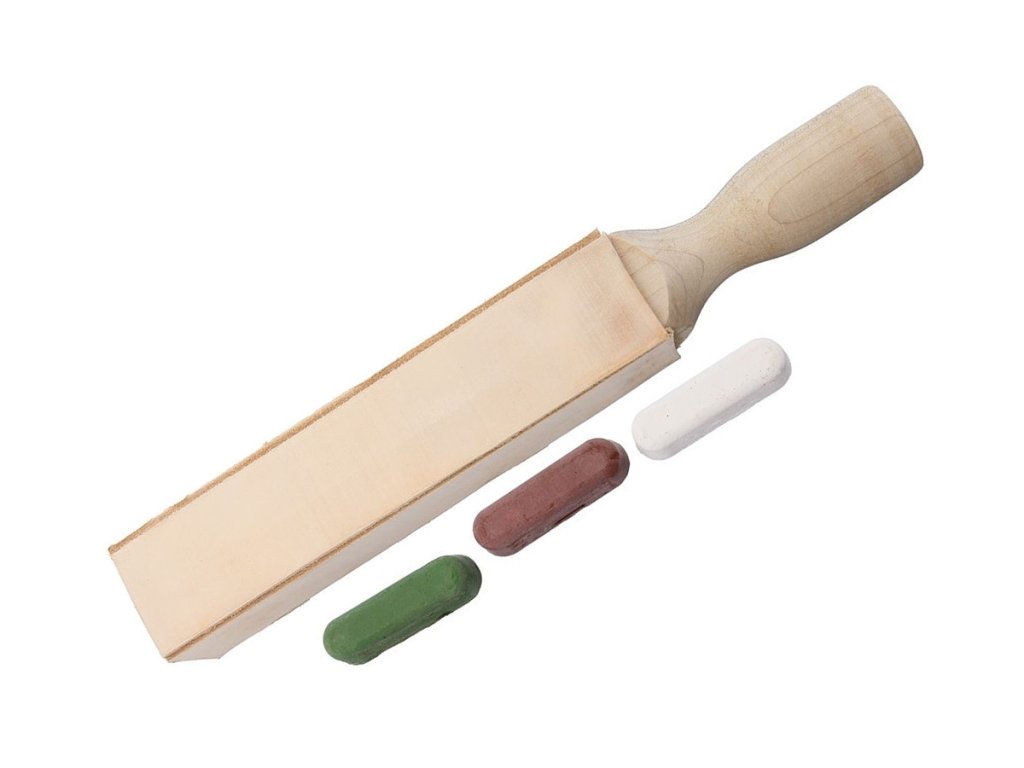 Piele pentru ascuțit cu mâner din arțar + paste pentru ascuțit cuțite - diferite granulații.