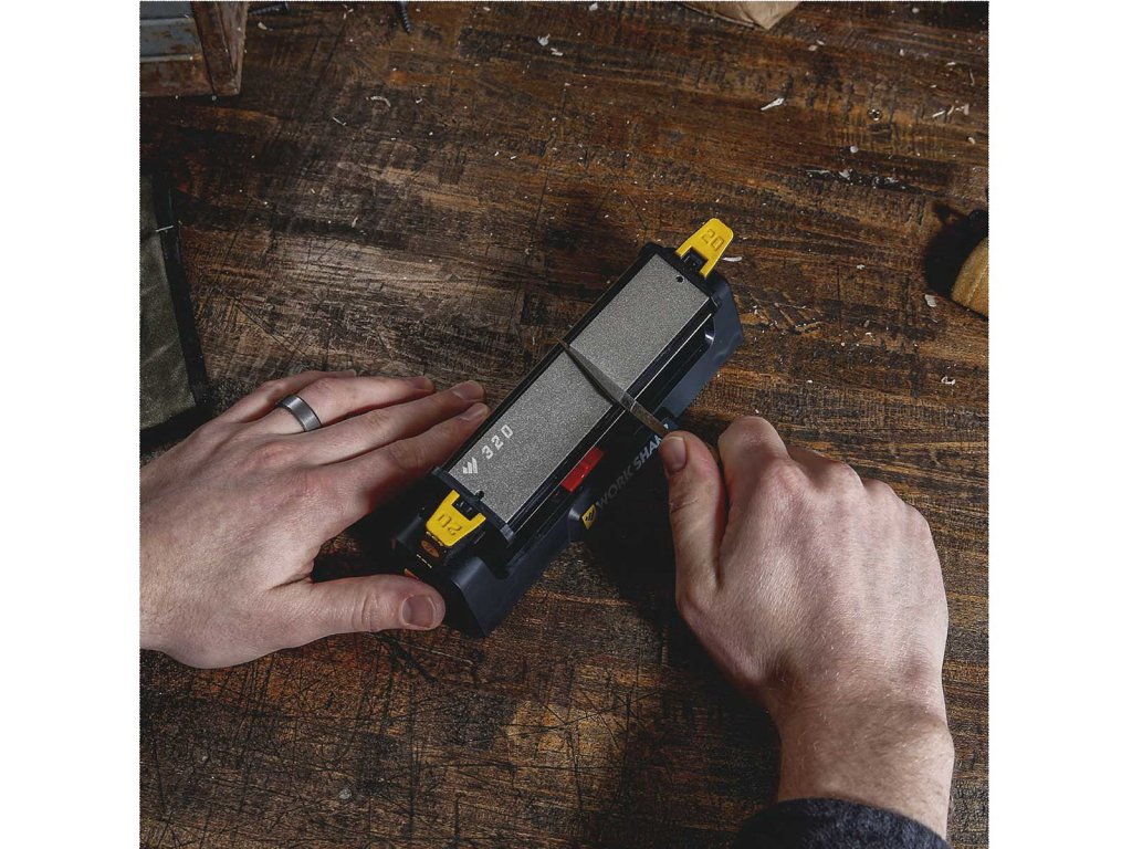 Dispozitivul de ascuțit Work Sharp Benchstone format dintr-o piatră de ascuțit combinată cu trei fețe. Conține două suprafețe pentru ascuțit diamantate cu granulațile 320 și 600 și o suprafață de ascuțit din ceramică cu granulație foarte fină. Dimensiunile suprafeței de ascuțit sunt 3,1 x 15,2 cm. Pe marginile pietrei există ghidaje pentru un unghi de ascuțire de 20° sau 25°. Aceste ghidaje pot fi îndepărtate cu ușurință, permițându-vă să ascuțiți la orice unghi. Acest dispozitiv de ascuțit ascute toate tipurile de cuțite, cum ar fi cuțite de buzunar și cuțite cu lama fixă și, de asemenea, poate fi utilizat și pentru cuțitele de bucătărie. Picioarele anti-alunecare asigură o ascuțire sigură și stabilă. Nu este nevoie de apă sau ulei, ceea ce permite o ascuțire mai rapidă și mai puțin timp pentru setare și curățare. Suprafețele abrazive pot fi înlocuibile.