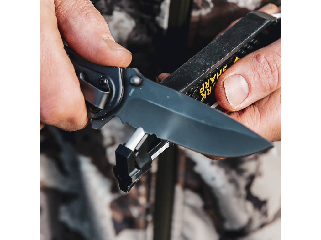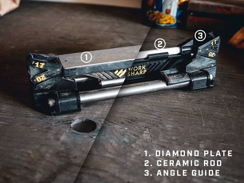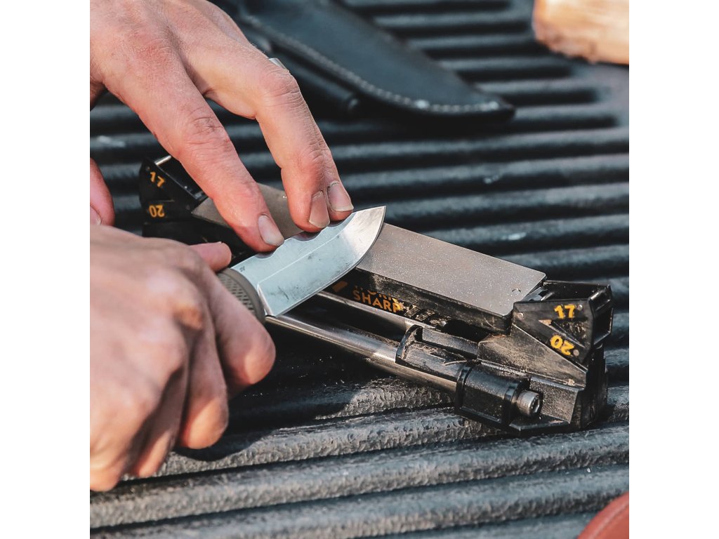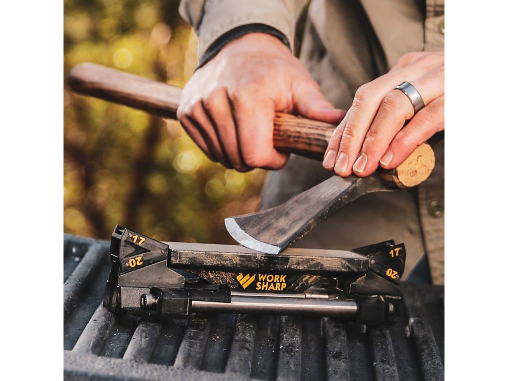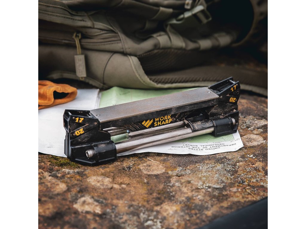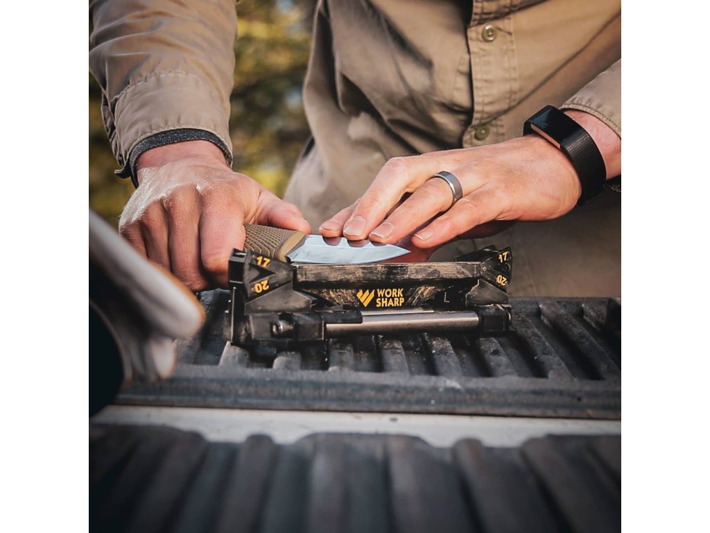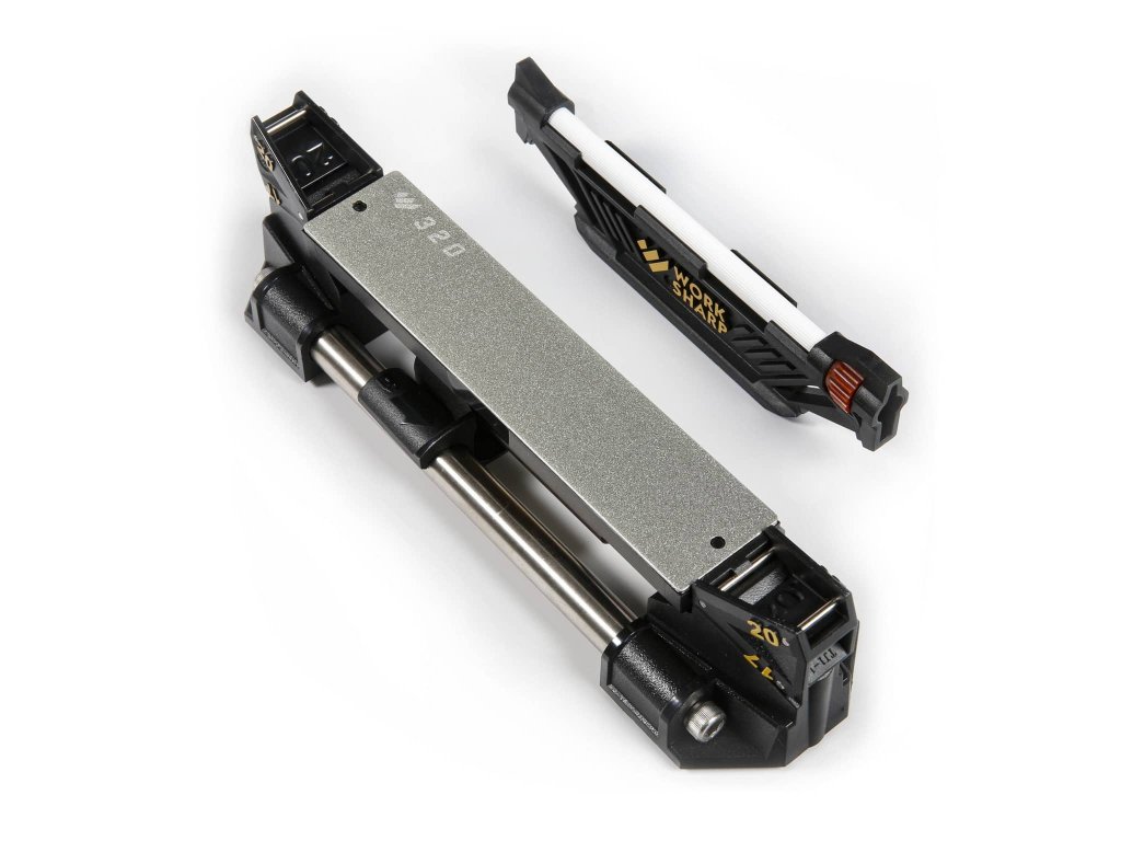 Dispozitiv de ascuțit Work Sharp Guided Sharpening System este un sistem complet de ascuțire și honuire de la Work Sharp®. GSS a fost creat atât pentru începători cât și pentru experimentați și poate fi folosit pentru ascuțirea oricărui cuțit pe care îl dețineți. Sistemul inovator Pivot-Response® urmărește curba lamei în timpul ascuțirii și produce un tăiș uniform pe toată lungimea lamei. Include două suprafețe pentru ascuțit diamantate cu granulații 320 și 600 (dimensiuni 15,2 x 3,1 cm) și trei tije ceramice cu granulație foarte fină. Există ghidaje pe margine pentru un unghile de ascuțire de 17° sau 20°.