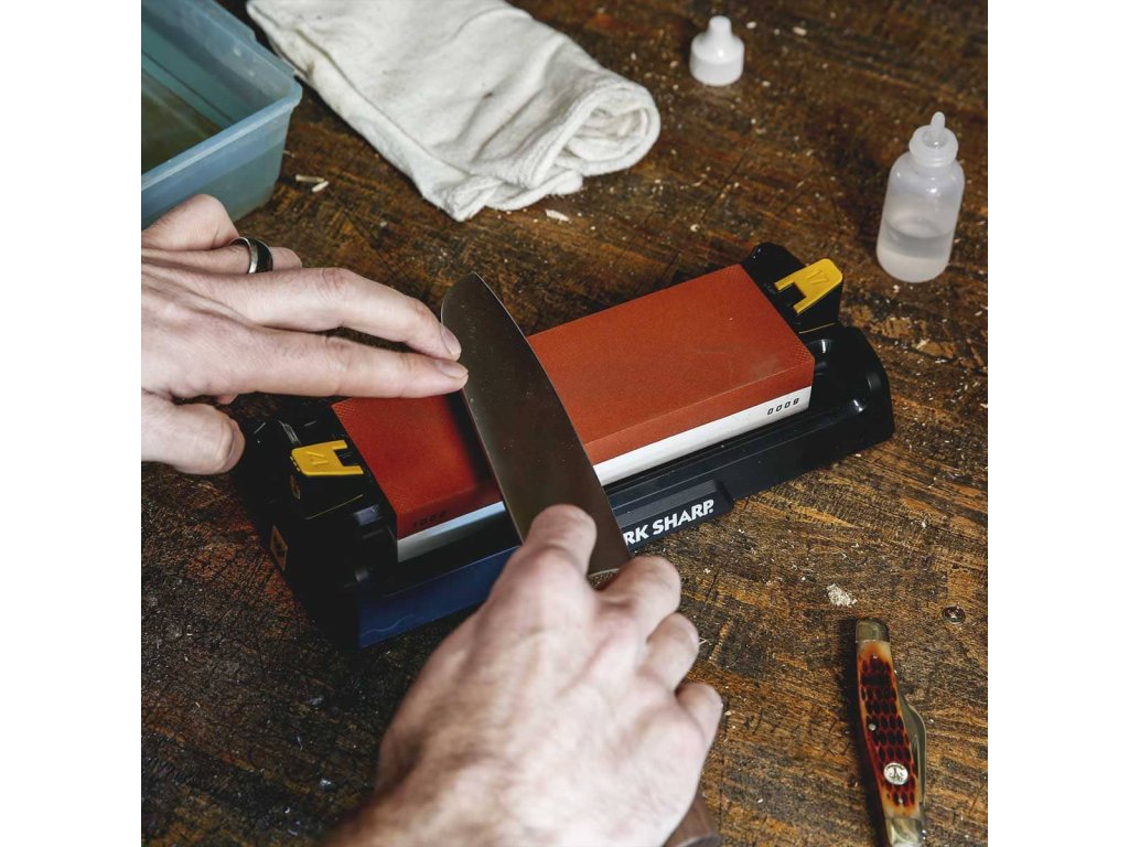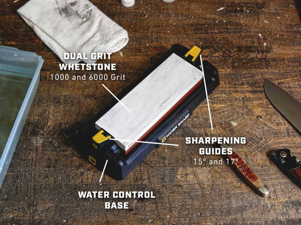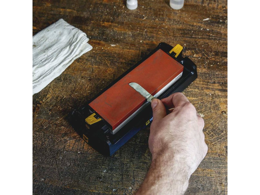 Dispozitivul de ascuțit Work Sharp Whetstone Knife Sharpener are două fețe pentru ascuțire. Conține două duprafețe de ascuțit din alumină (corundum) cu granulații 1000 și 6000. Dimensiunile suprafeței de ascuțire sunt 18 x 5,8 cm. Există ghidaje pe margini pentru un unghi de ascuțire de 15° sau 17°. Aceste ghidaje pot fi îndepărtate cu ușurință și puteți ascuți la orice unghi. Acest dispozitiv de ascuțit va ascuți cuțite de buzunar, cuțite cu lamă fixă de toate tipurile și poate fi utilizată și pentru cuțitele de bucătărie. Picioarele anti-alunecare asigură o ascuțire sigură și stabilă. Se folosește pentru ascuțirea cu apă. Suprafața de ascuțit este înlocuibilă.