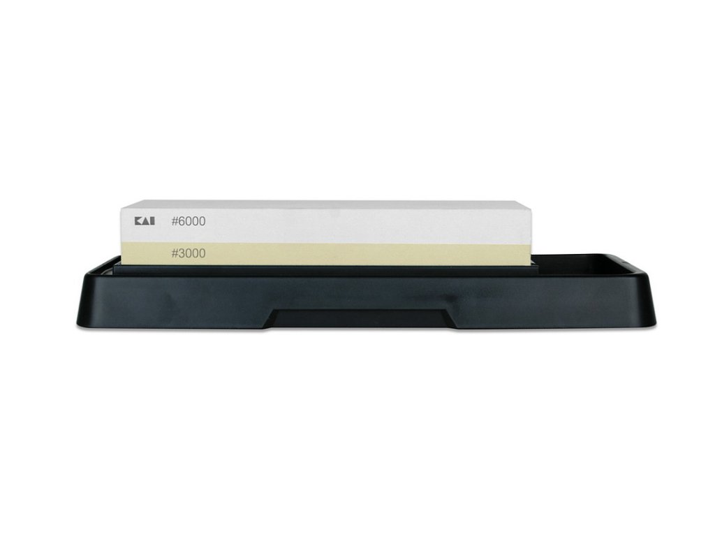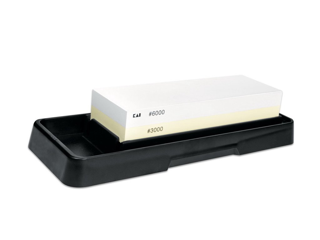 Piatră de ascuțit combinată KAI cu o granulație 3000 pentru ascuțirea inițială a cuțitelor și granulație 6000 pentru ascuțirea fină sau întreținerea tăișurilor.