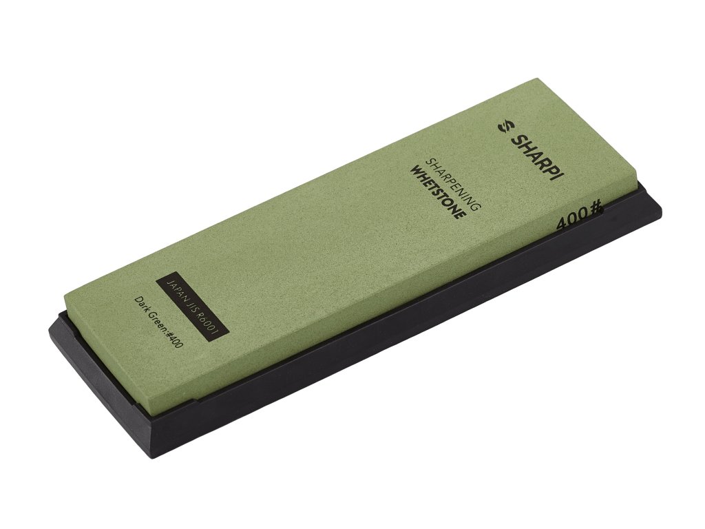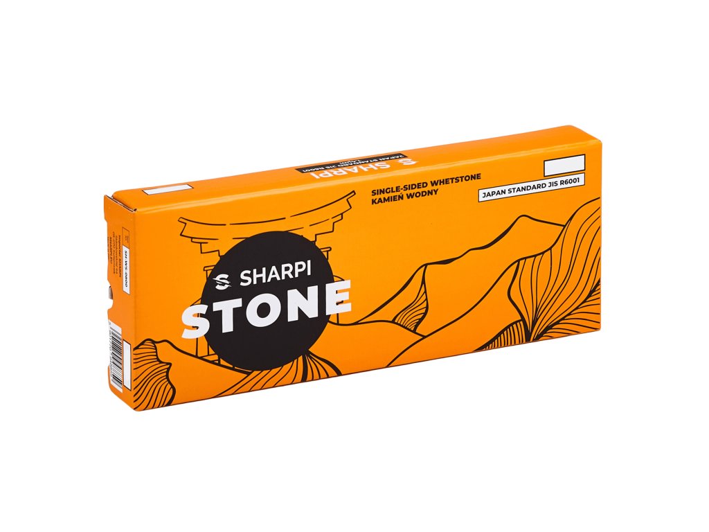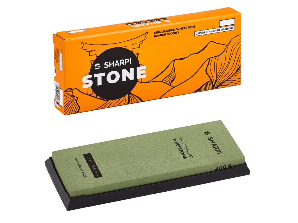 Piatră de ascuțit cu apă Sharpi, granulație 400 conform standardului japonez JIS. Piatra este fabricată din corindon și trebuie umezită cu apă înainte de ascuțire. Pachetul include și un suport din plastic pentru fixarea pietrei.