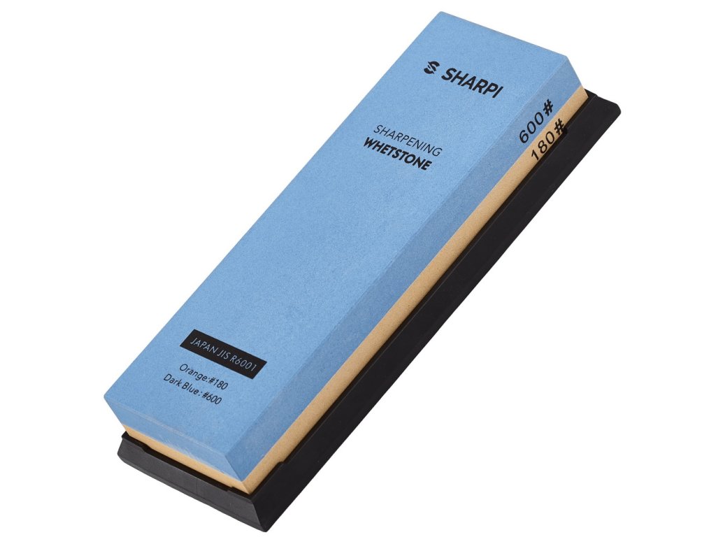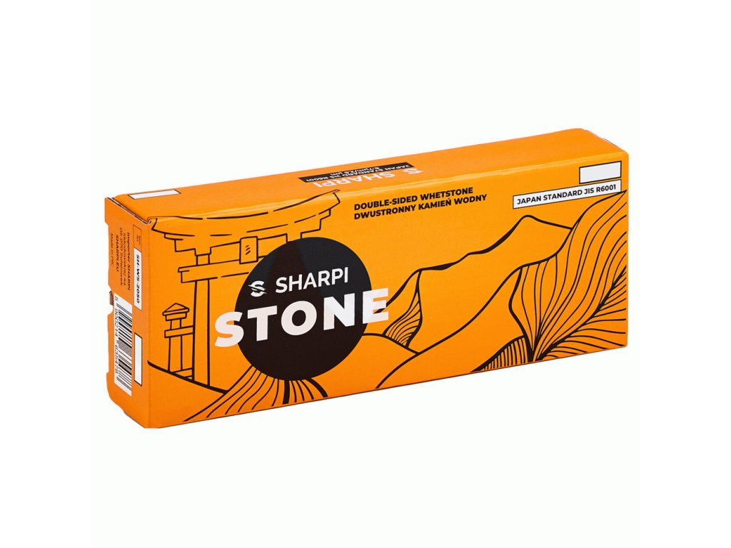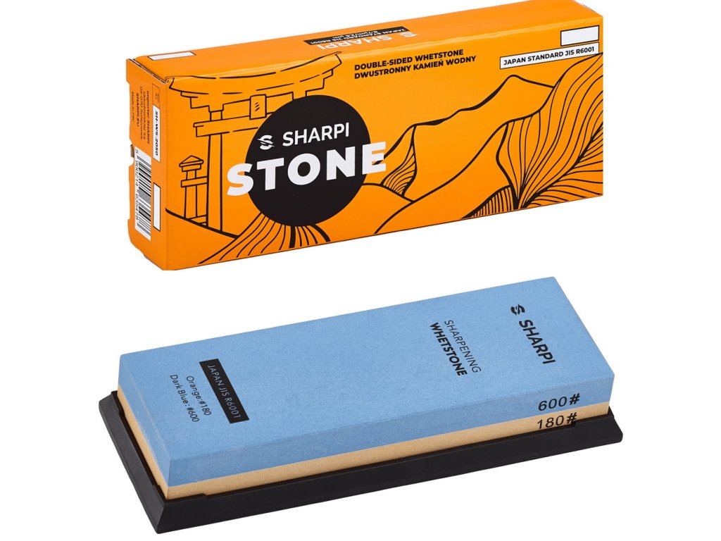 Piatră combinată de ascuțit Sharpi, granulații 180/600 conform standardului japonez JIS. Piatra este fabricată din corindon și înainte de utilizare trebuie să fie umezită cu apă. Este inclusă o carcasă din plastic pentru susținerea pietrei.