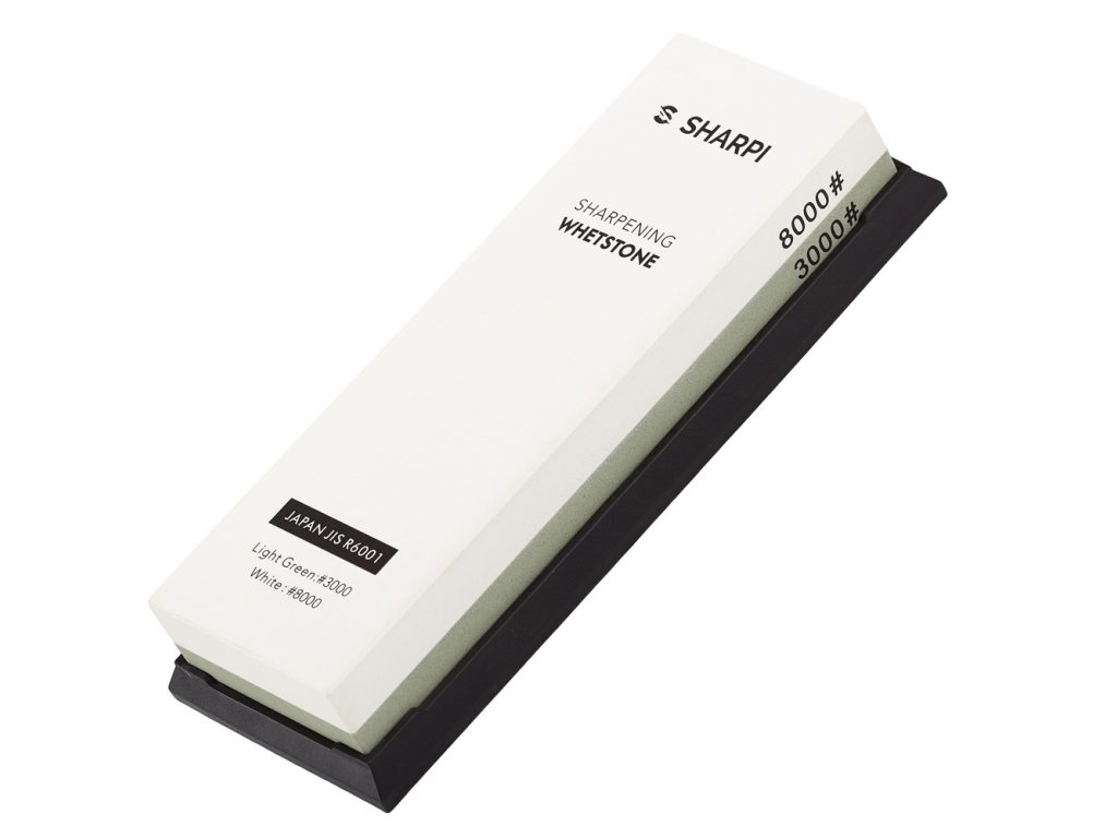 Piatră combinată de ascuțit Sharpi, granulații 3000/8000 conform standardului japonez JIS. Piatra este fabricată din corindon și înainte de utilizare trebuie să fie umezită cu apă. Este inclusă o carcasă din plastic pentru susținerea pietrei.