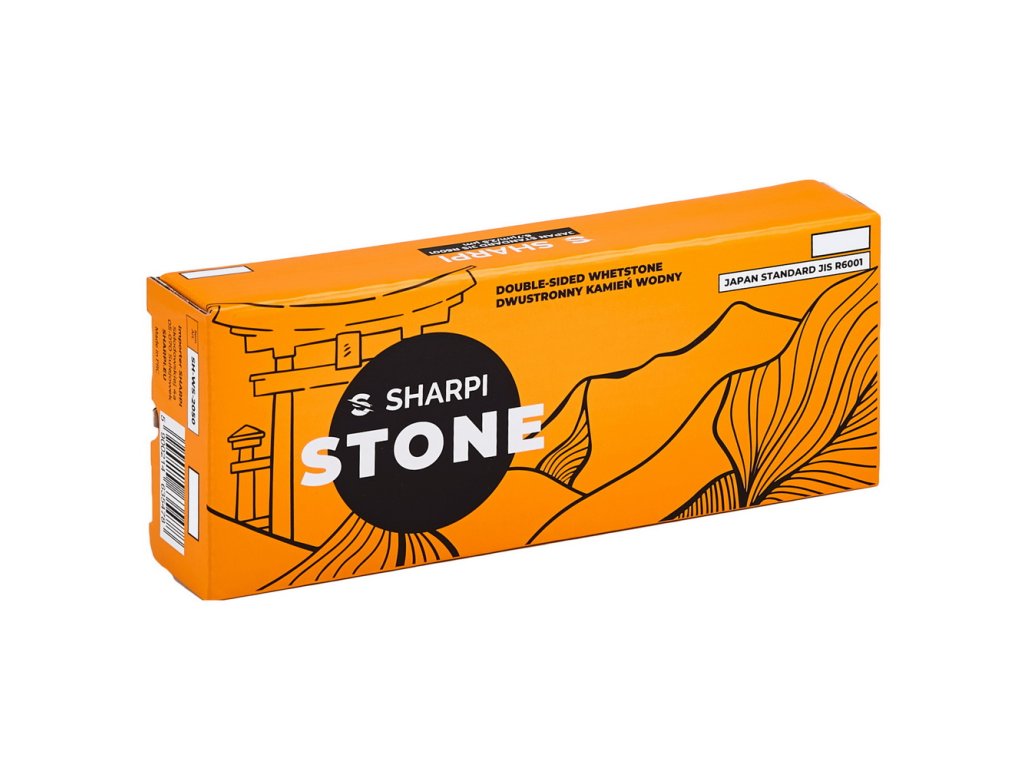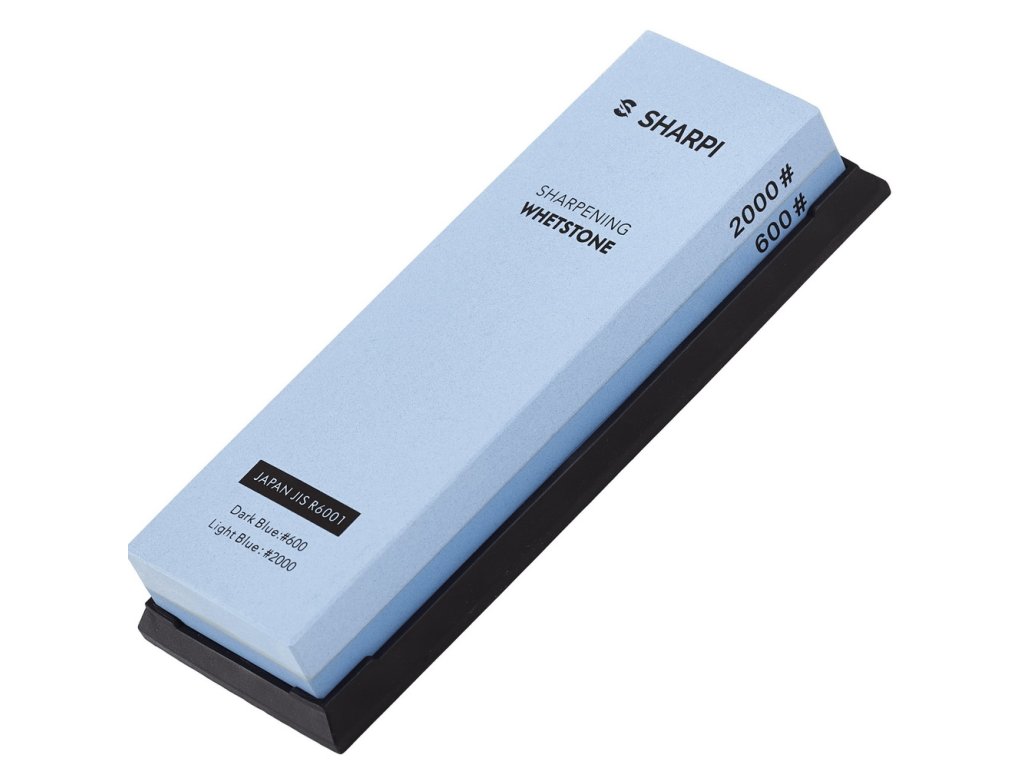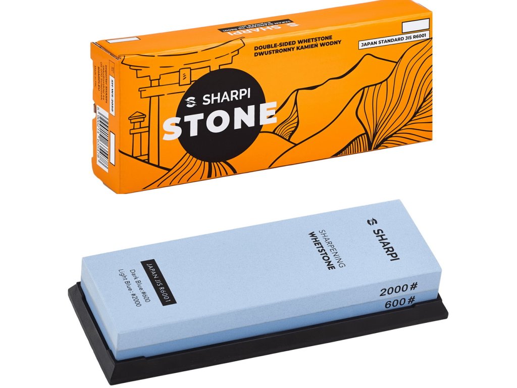 Piatră combinată de ascuțit Sharpi, granulații 600/2000 conform standardului japonez JIS. Piatra este fabricată din corindon și înainte de utilizare trebuie să fie umezită cu apă. Este inclusă o carcasă din plastic pentru susținerea pietrei.