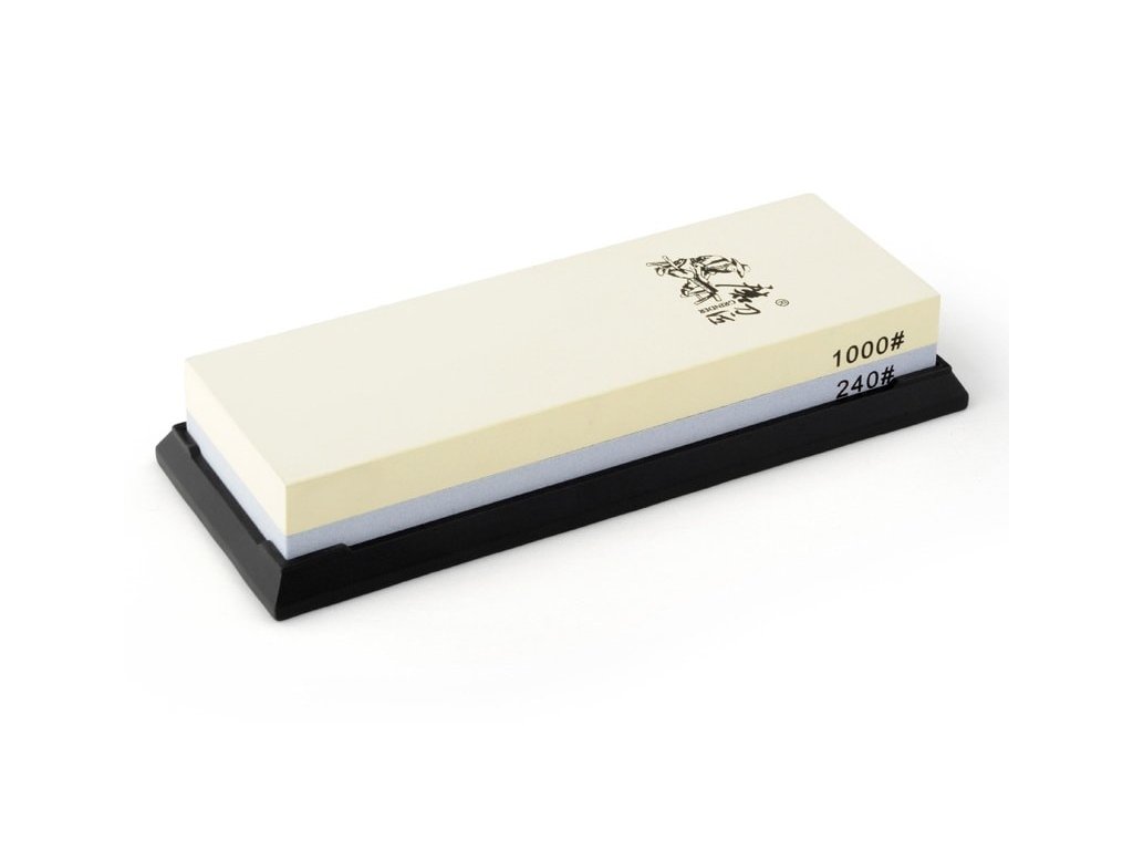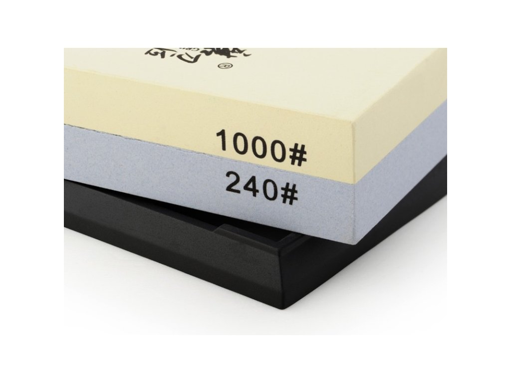 Piatră ceramică combinată de ascuțit cu granulațiile 240 și 1000, potrivită pentru ascuțirea cuțitelor tocite. Această piatră este concepută pentru ascuțirea cu apă. Doar înmuiați piatra în apă timp de câteva minute înainte de utilizare. Granulația 240 este destinată ascuțirii inițiale grosiere a unui cuțit tocit. Granulația 1000 este destinată pentru ascuțirea fină.
