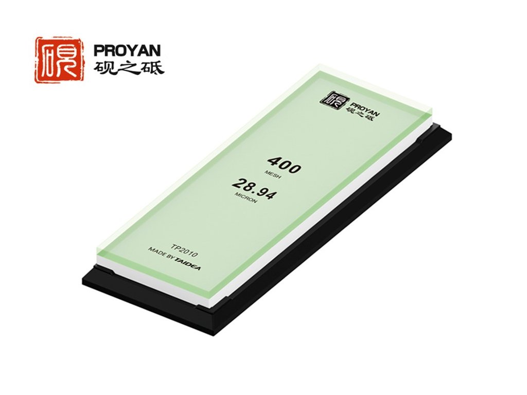 Piatră de ascuțit cu apă, granulație 400. Piatra are o bază din sticlă întărită la partea inferioară. Datorită acestui fapt, piatra nu suferă deformări și nu există riscul de îndoiri. Pietrele de ascuțit convenționale cuțite se pot deforma microscopic prin absorbția apei, însă piatra de ascuțit Taidea Glass Stone rezolvă această problemă prin baza lor extrem de netedă din sticlă întărită. Un alt avantaj al bazei de sticlă este că valoarea granulației înscrisă pe partea inferioară este întotdeauna vizibilă, chiar și după o utilizare îndelungată. Dimensiunile suprafeței de ascuțit cuțite sunt de 20 x 7 cm, astfel încât și cuțitele mai mari pot fi ascuțite confortabil pe piatră. Piatra se află într-o bază din plastic. Picioarele anti-alunecare de pe bază asigură o ascuțire sigură și stabilă. Această piatră de ascuțit va ascuți cuțite de buzunar, cuțite cu lamă fixă de toate tipurile și poate fi utilizată și pentru cuțite de bucătărie.