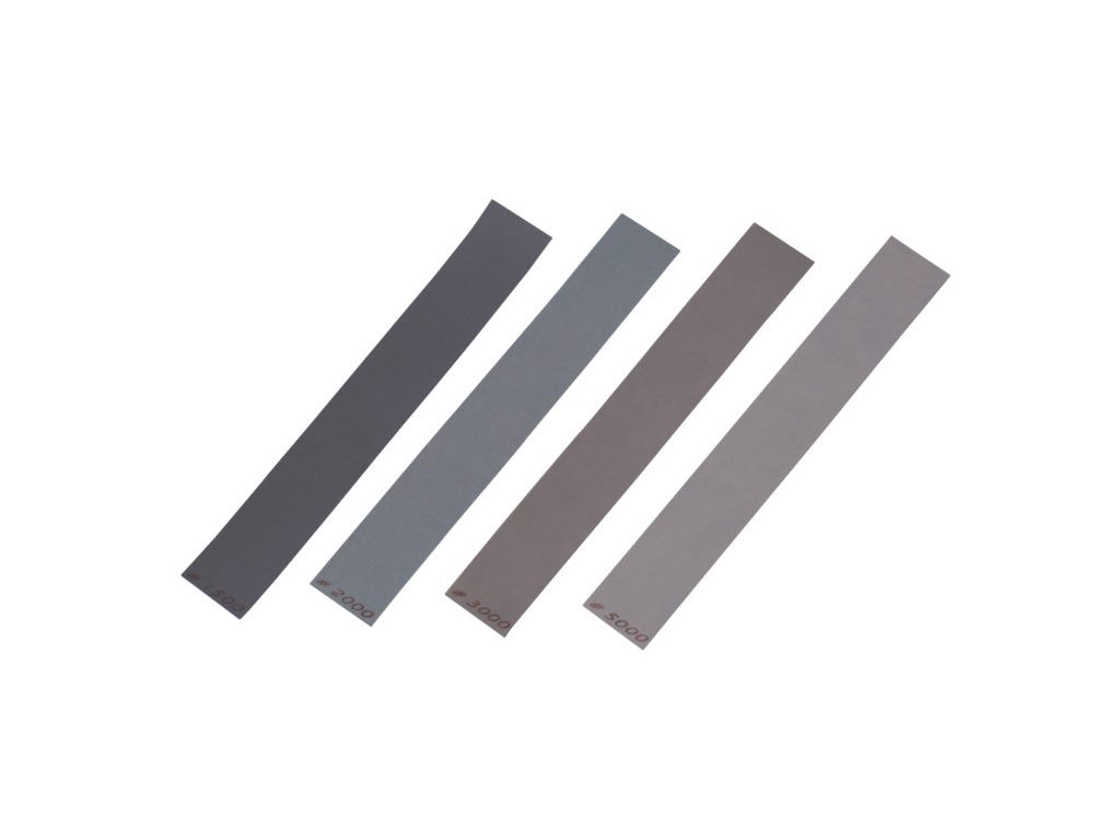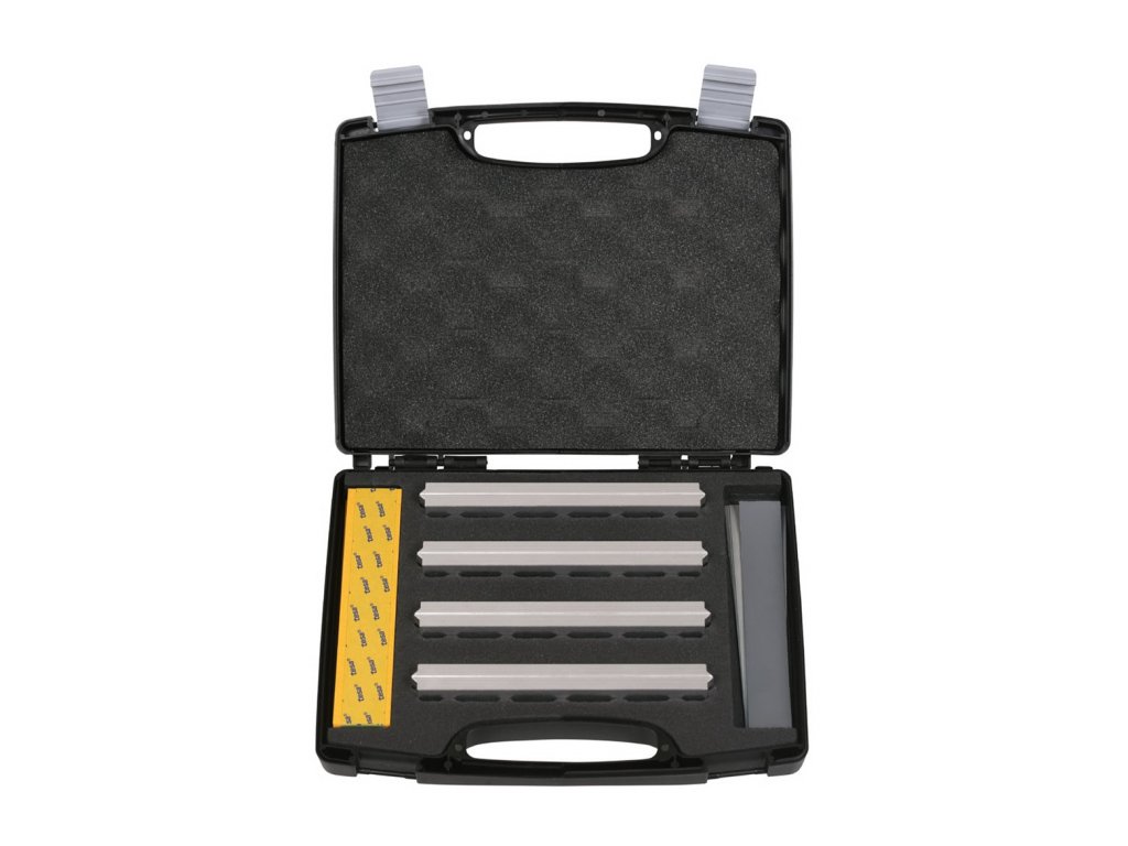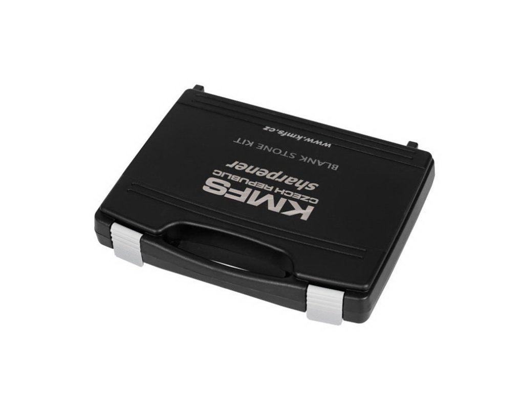 Set de pietre de ascuțit KMFS, conceput pentru setul KMFS River. Setul include 4 perechi de „pietre” (suporturi) din duraluminiu, 32 bucăți de matrițe adezive față-verso pentru montarea șmirghelului, 32 bucăți de matrițe de ascuțit cuțite SiC de granulație 8×1500, 8×2000, 8×3000, 8×5000. Ascuțirea tăișului se face prin deplasarea în direcția tăișului, pietrele sunt concepute pentru a fi umezite cu apă la ascuțire, dar ascuțirea se poate face și pe uscat. Acest set de pietre pentru ascuțite cuțite este livrat într-o cutie din plastic cu umplutură din spumă.