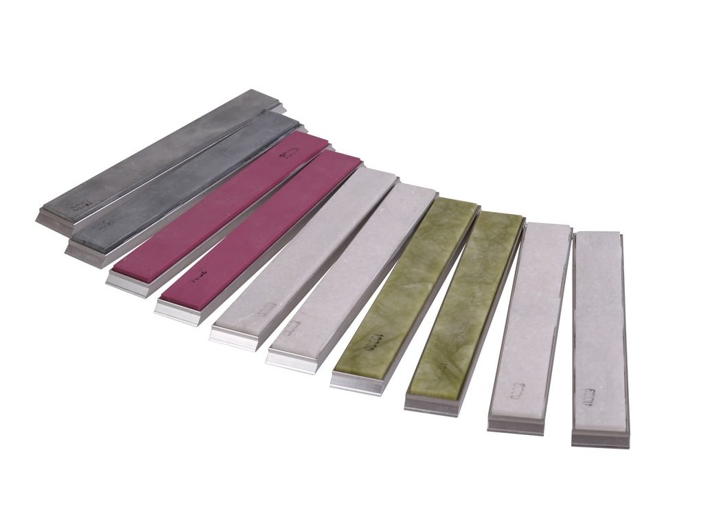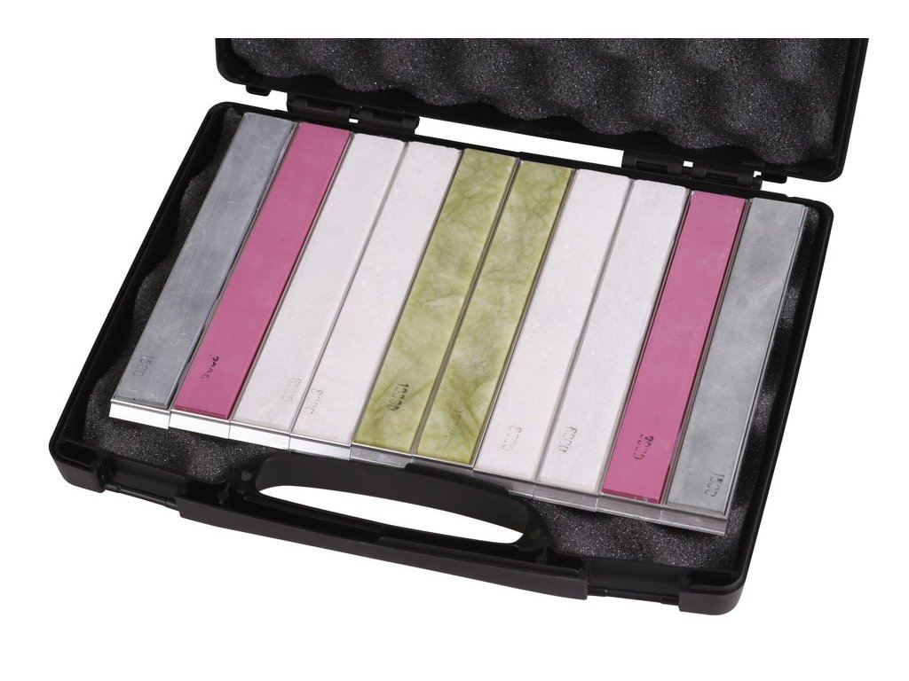 Set de pietre de ascuțit cuțite KMFS extrafine speciale, concepute pentru setul KMFS River. Setul conține 10 pietre ceramice de ascuțit cuțitecu granulații pietrei 2x 1500, 2x 3000, 2x 6000, 2x 8000 și 2x 10 000. Pietrele de ascuțit cuțite sunt montate în suporturi de precizie din duraluminiu. Datorită fineții lor ridicate, aceste pietre asigură ascuțirea până la o finețe extremă a tăișurilor. Llivrat într-o cutie din plastic cu umplutură din spumă.