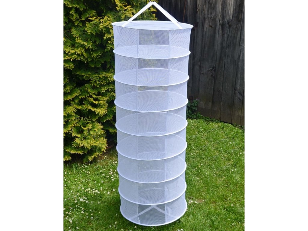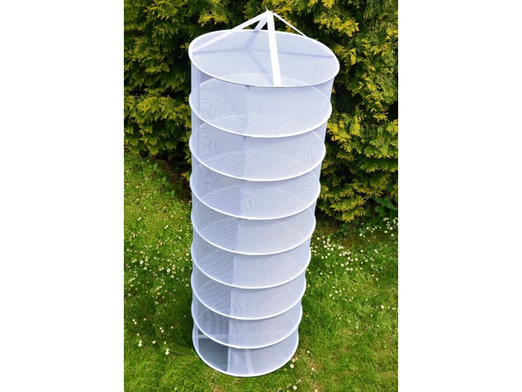Plasă rotundă pliabilă pentru uscarea ciupercilor sau a plantelor. Cele 8 niveluri ale plasei, cu un diametru de 56,5cm, oferă o suprafață totală de peste 2m². Înălțimea plasei atunci când este desfăcută este de 165cm.