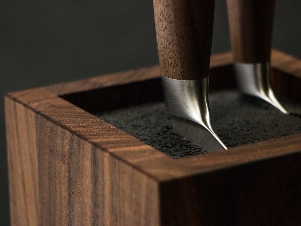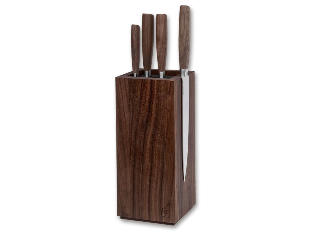 Lamele cuțitelor sunt fabricate din oțel crom-molibden-vanadiu X50CrMoV15, care este mai durabil și rezistă mai bine la uzură în comparație cu cuțitele pentru bucătărie convenționale. Mânerul din lemn de nuc se simte foarte bine în mână, este cald la atingere și conferă cuțitului un aspect atractiv.