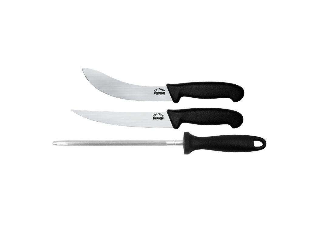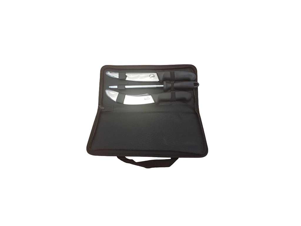 Set de cuțite din seria Butcher. Mâner din plastic TPE, lame din oțel inoxidabil AUS-8. Setul include o geantă, 2 cuțite de bucătărie și un masat.
