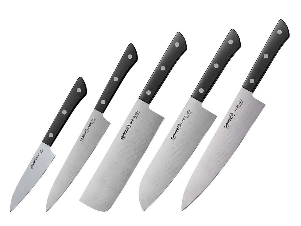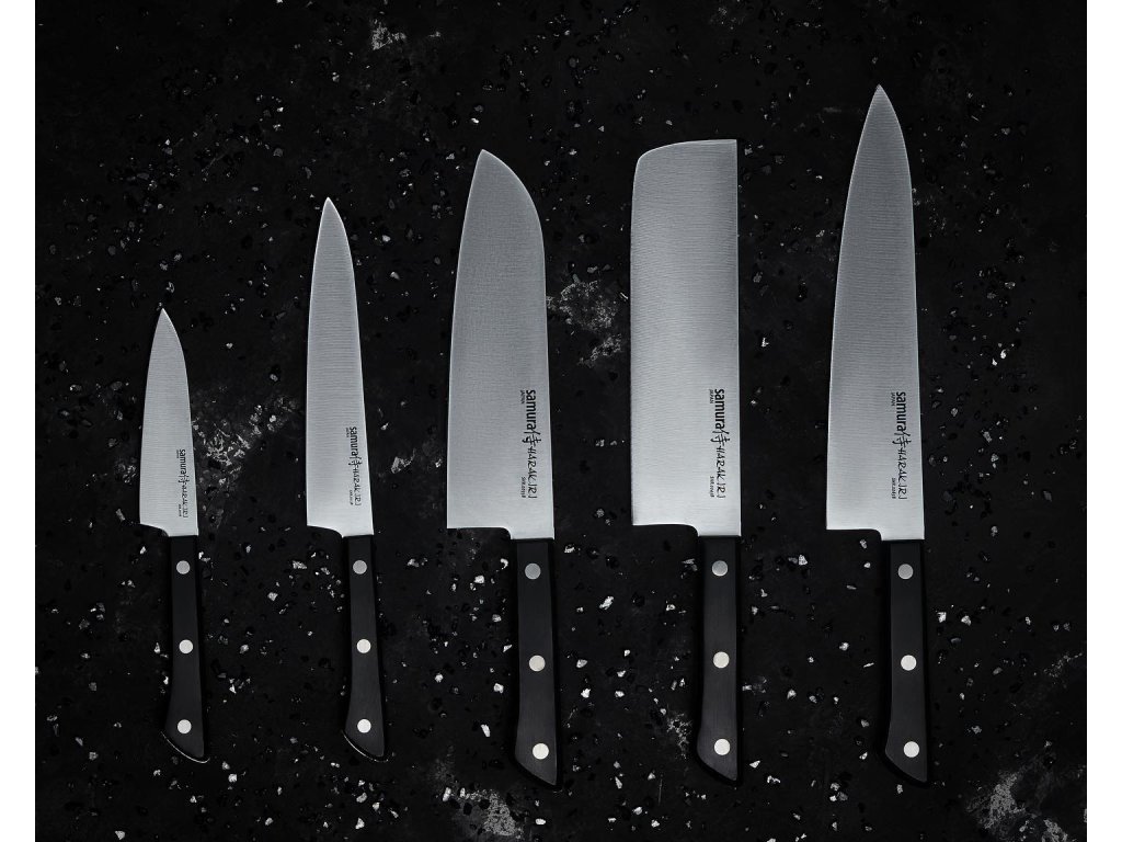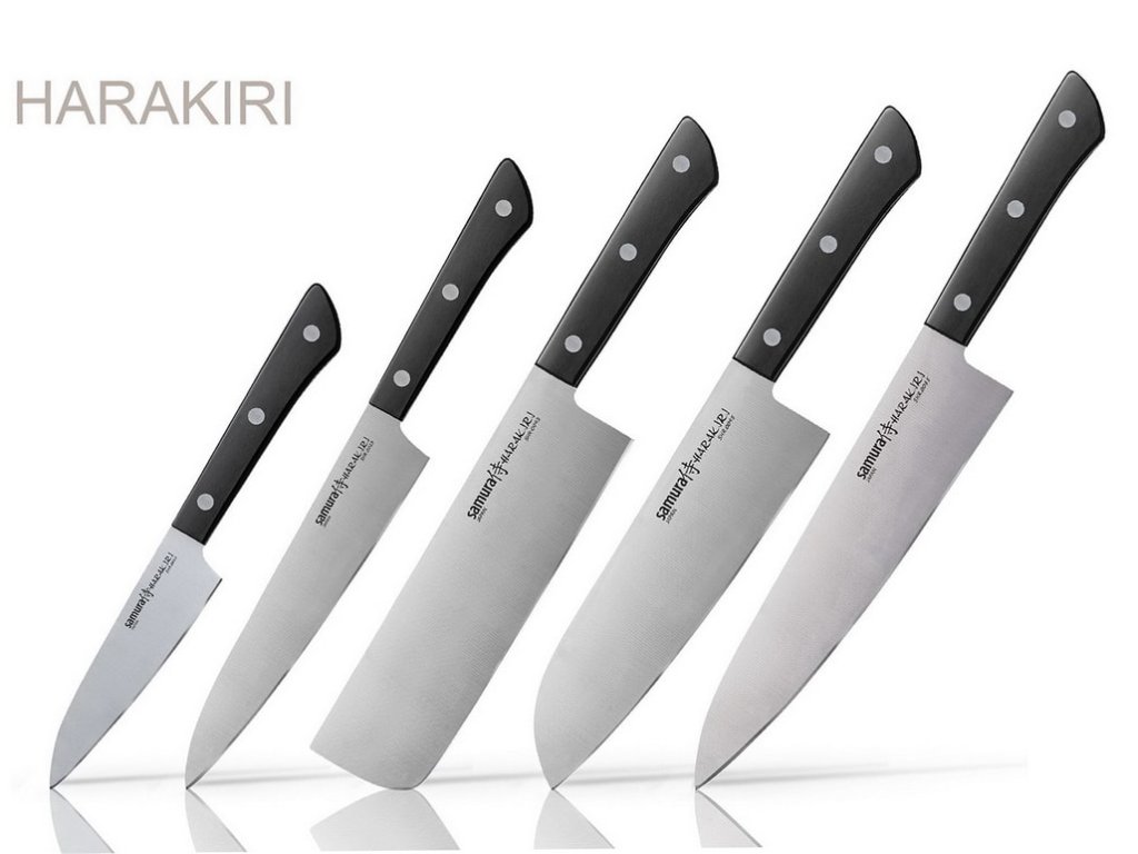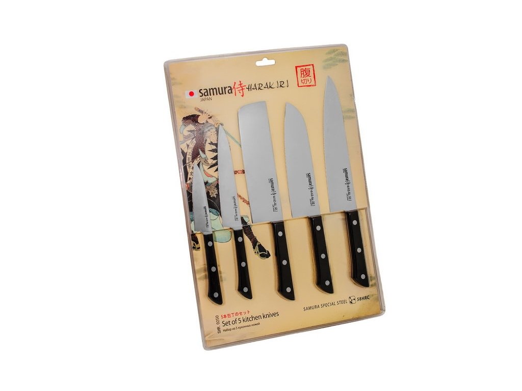 Set de cinci cuțite de bucătărie Samura din seria Harakiri. Cuțitele Samura Harakiri aduc o combinație între o lamă subțire din oțel japonez și un mâner practic din plastic ABS. Acestea sunt ușoare și oferă un echilibru foarte bun între calitate, design și preț.