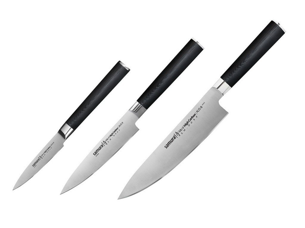 Set luxos de cuțite pentru bucătărie Samura din seria Mo-V, într-o cutie elegantă de cadou. Cuțitele pentru bucătărie Samura Mo-V sunt cuțite de bucătărie premium și oferă o combinație a celor mai bune caracteristici ale cuțitelor japoneze și europene. Setul include 3 cuțite - un cuțit de bucătar, un cuțit universal și un cuțit pentru legume.