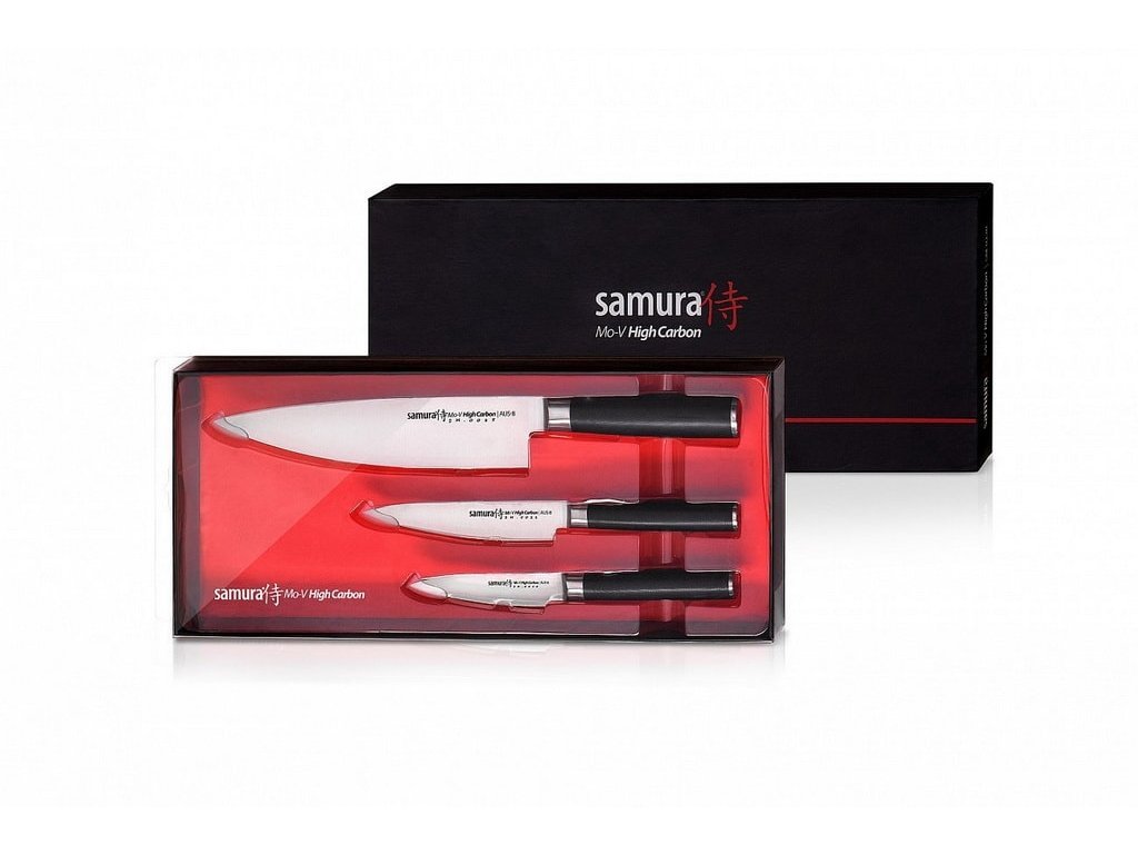 Set luxos de cuțite pentru bucătărie Samura din seria Mo-V. Cuțitele pentru bucătărie Samura Mo-V sunt cuțite de bucătărie premium și oferă o combinație a celor mai bune caracteristici ale cuțitelor japoneze și europene. Setul include 3 cuțite - un cuțit de bucătar, un cuțit universal și un cuțit pentru legume.