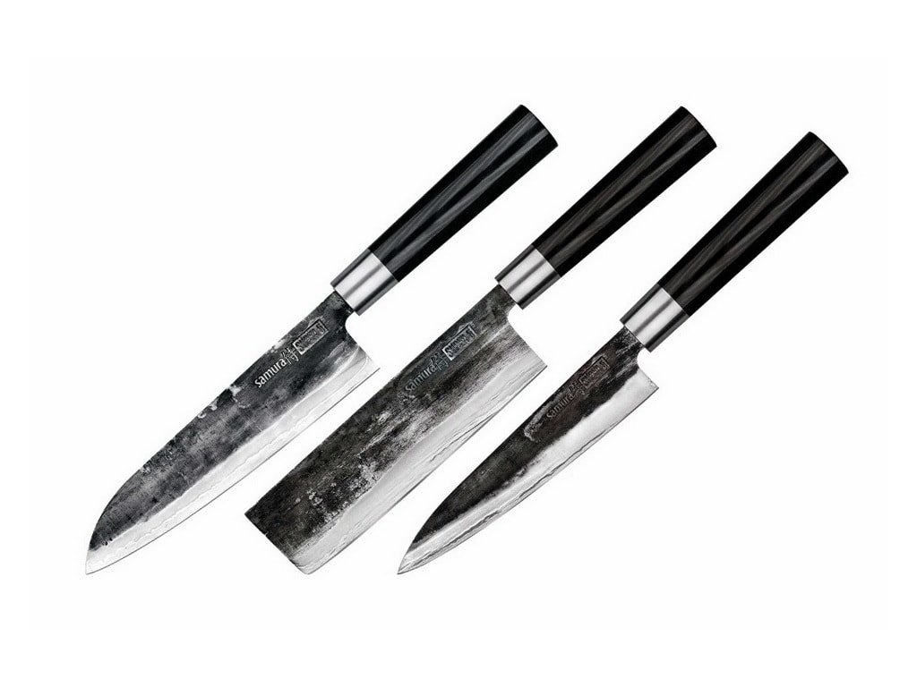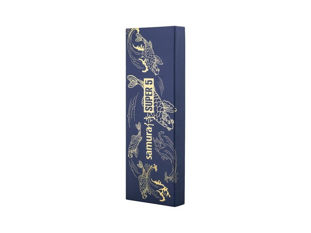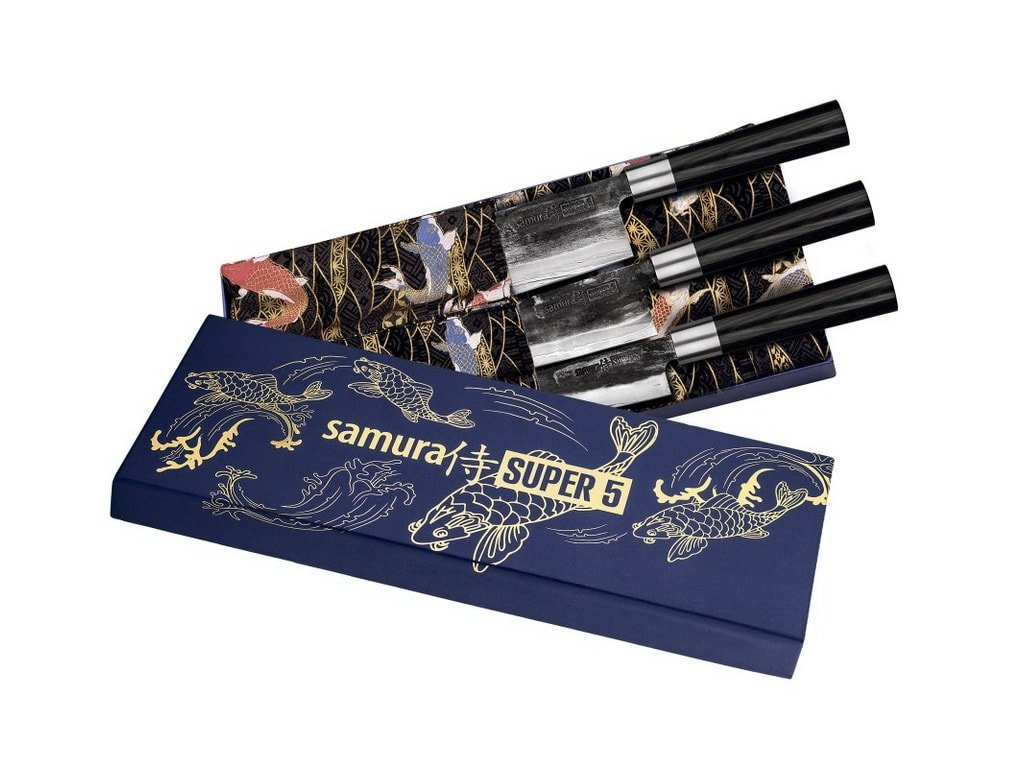 Set de cuțite pentru bucătărie Samura din seria Super 5. Cuțitele de bucătărie Samura Super 5 sunt cuțite pentru bucătărie exclusive fabricate din oțel de damasc japonez forjat manual (5 straturi) cu miez din oțel VG-10. Setul include 3 cuțite - un cuțit universal, un cuțit Nakiri și un cuțit Santoku. Cuțitele sunt ambalate într-un ambalaj foarte frumos din pânză în stil japonez și plasate într-o cutie cadou.